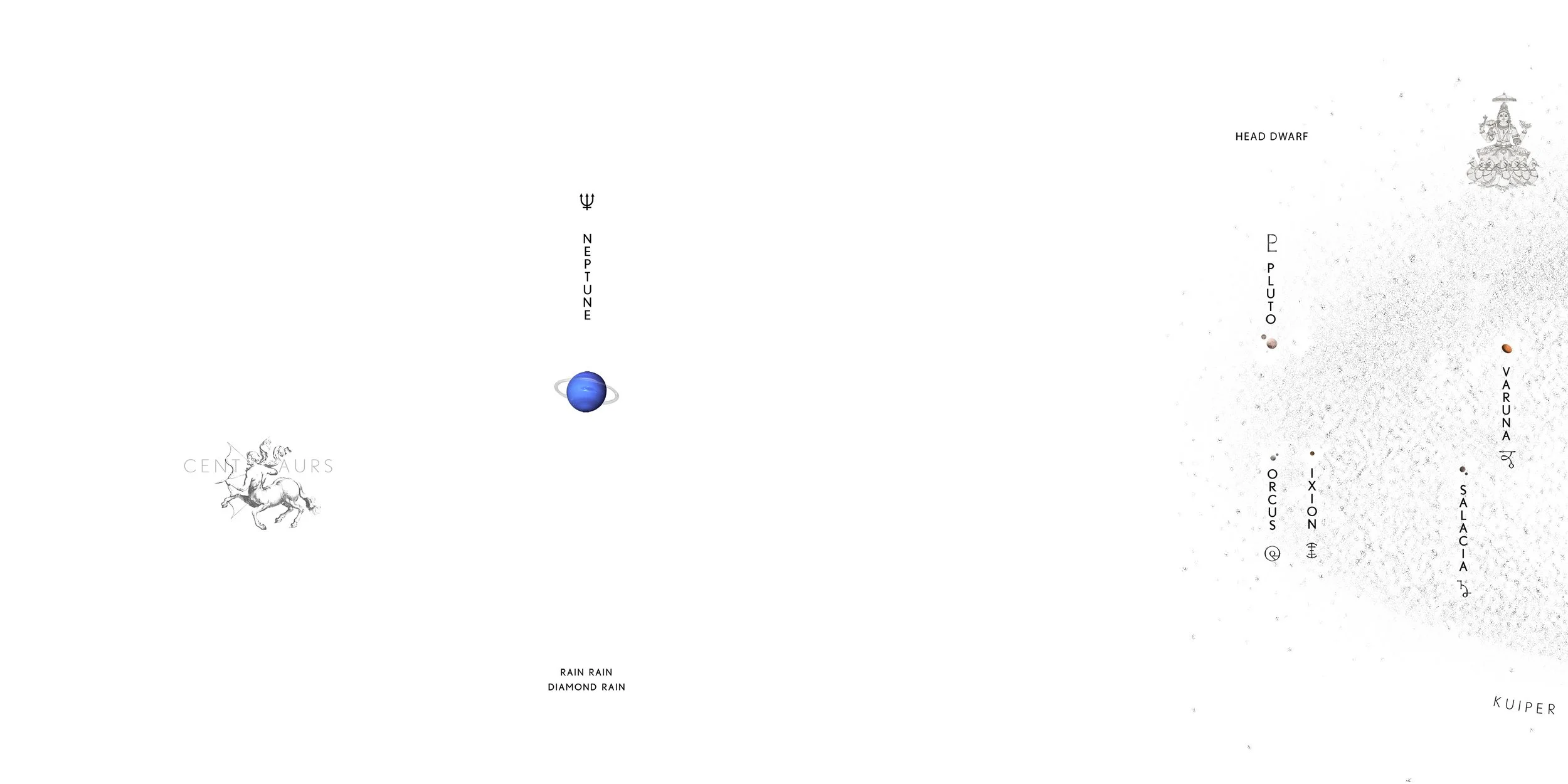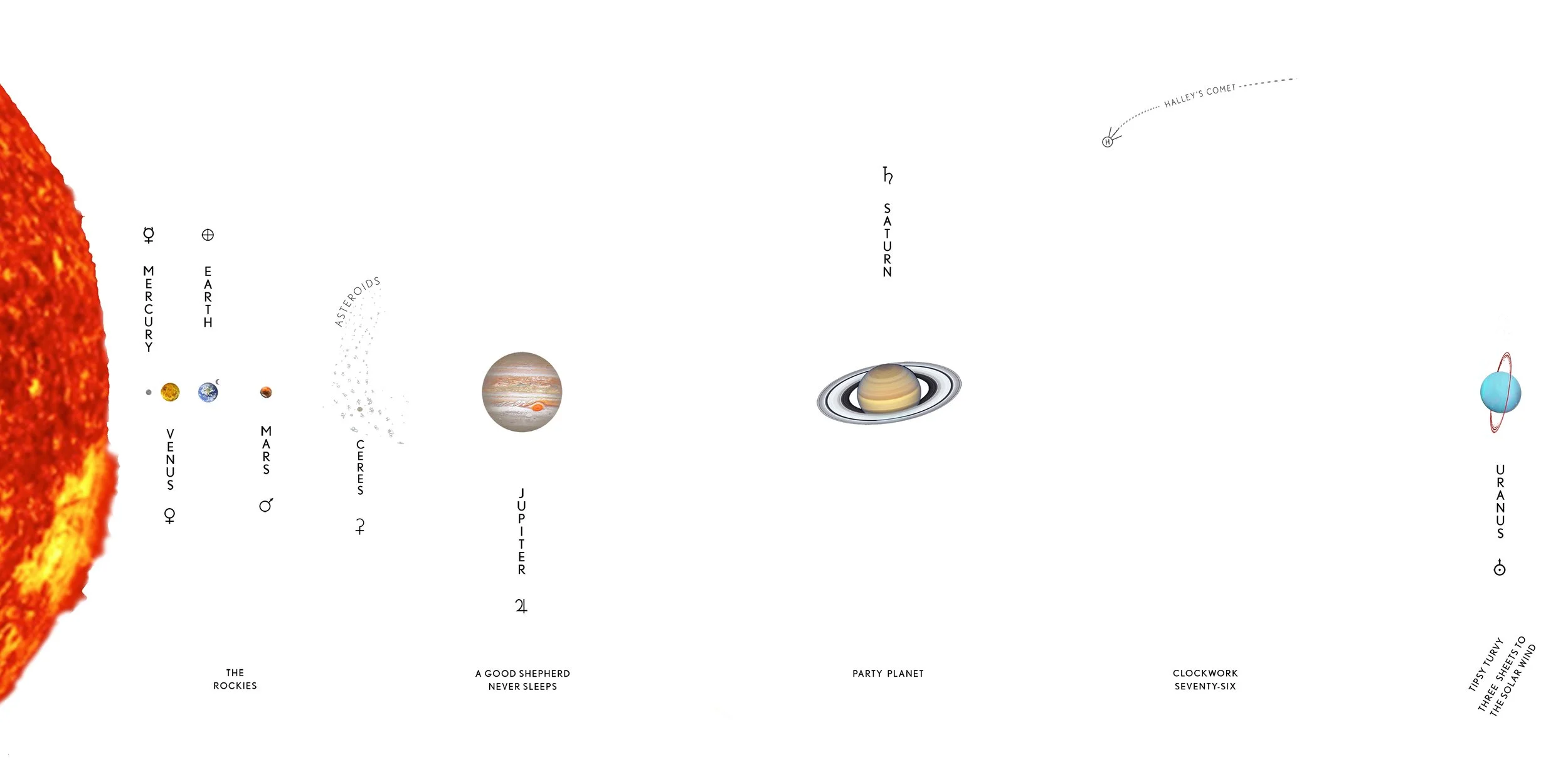 Neptune, where diamonds rain. Mercury, where a day is longer than a year. Ceres, the asteroid where water bubbles. Here comes the sun, and there goes our disappearing Moon. Eight planets, seven dwarfs, a clockwork comet and the orphan child of another sun . . . all in the theater of vanishing horizons.