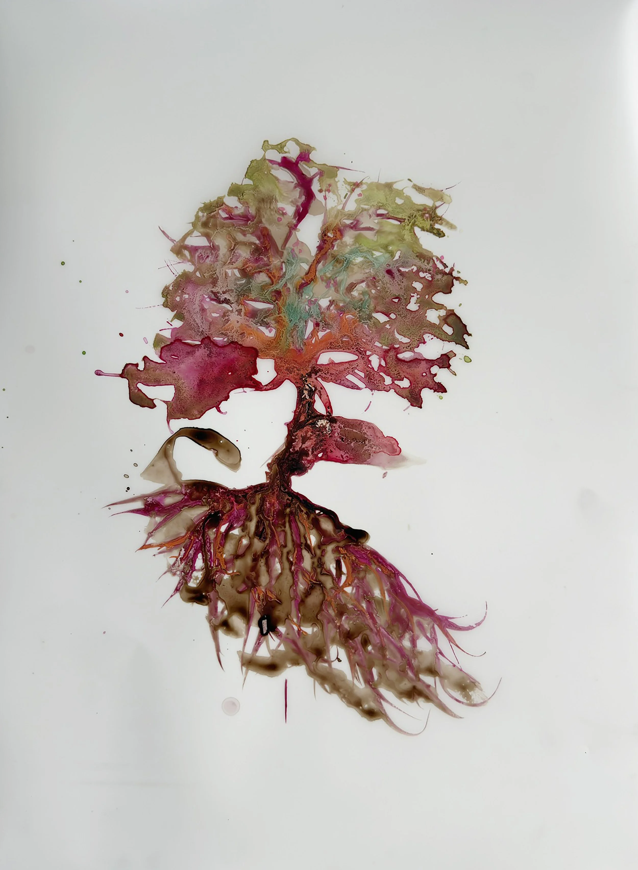 Irene Pantelis' Studio Gallery exhibition Bitter Bark recounts a personal and historical journey centered on the cinchona tree, source of quinine and long used to treat fevers. After discovering a photograph of this tree in her father’s Bolivian hometown, she tasted cinchona bark and began researching its global movement from Andean forests through colonial trade and medicine. The resulting paintings, made with watercolor, ink, and cinchona-derived dye, explore extraction, healing, migration, and survival. As pigments spread and settle, the quinine tree emerges as subject, witness, and living archive of memory, illness, empire, and the fragile persistence of life across landscapes and generations through time and care.