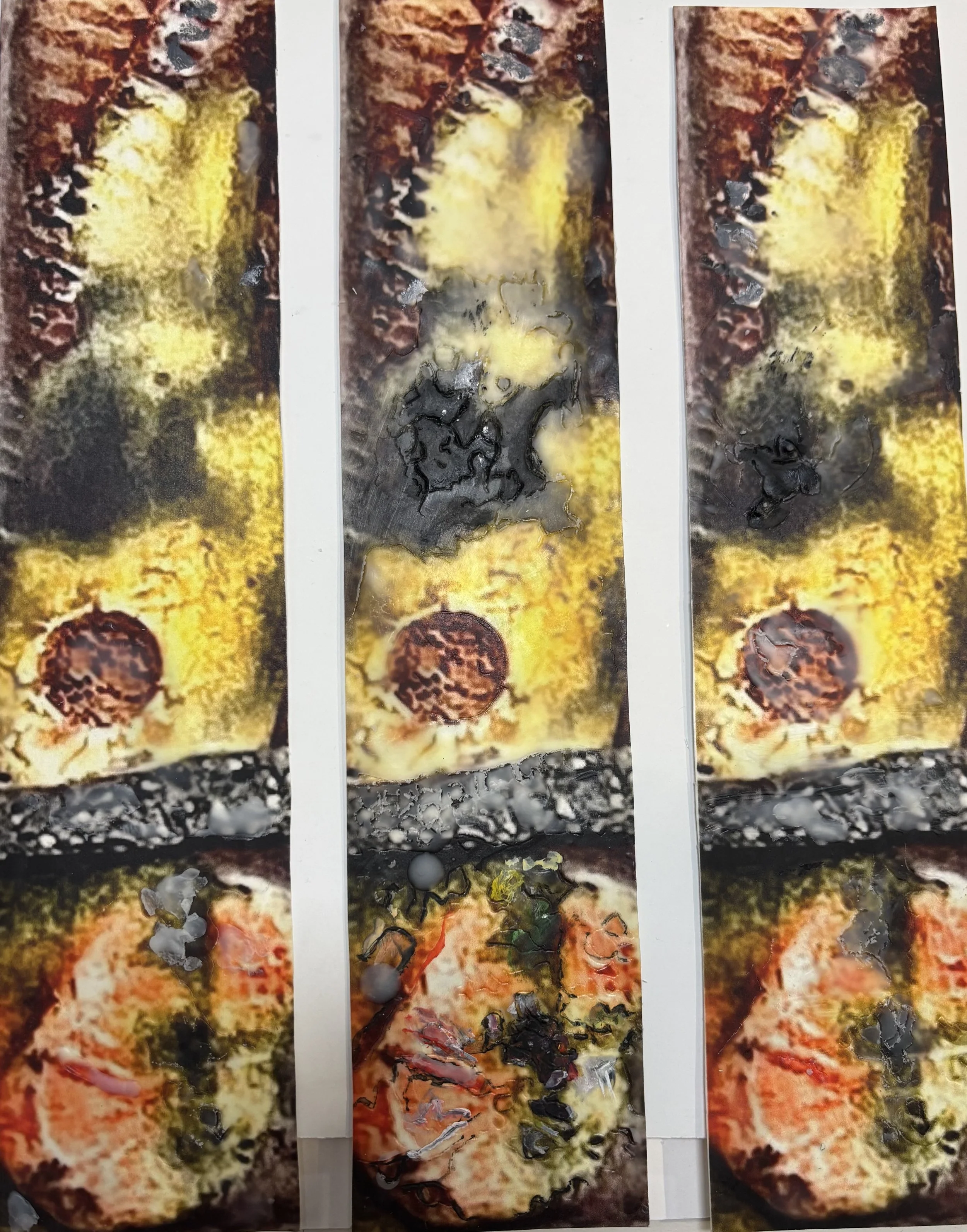 Harriet Lesser presents a series of works created using materials such as beeswax and carving tools, where layered surfaces and hand-worked textures explore a quiet balance between control and chance. Her practice invites close looking, revealing subtle, organic transformations within each piece.