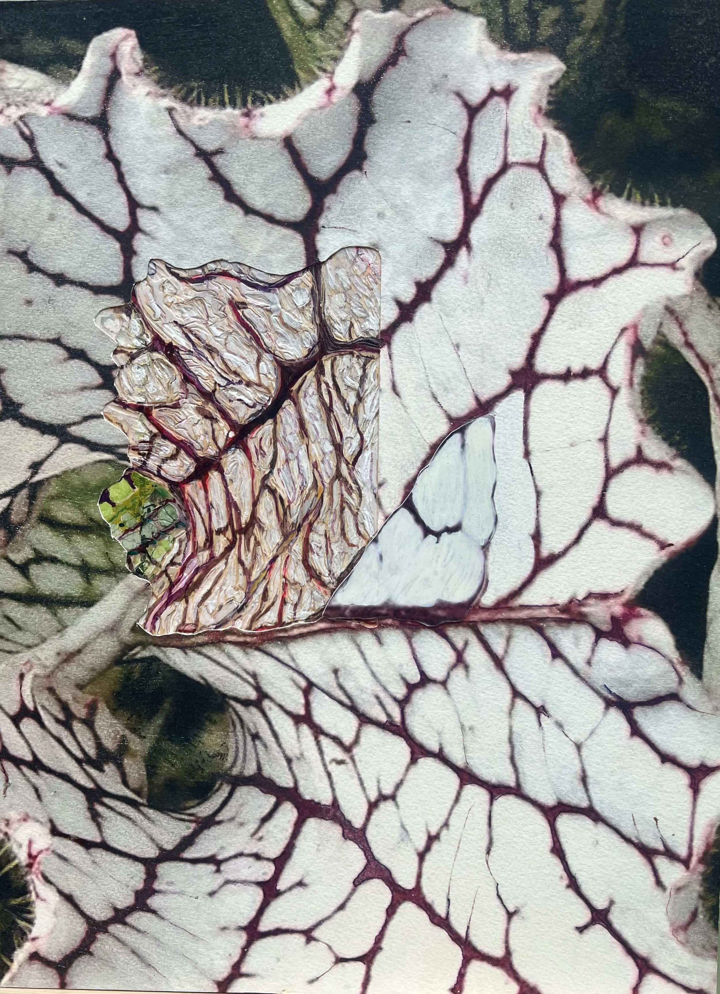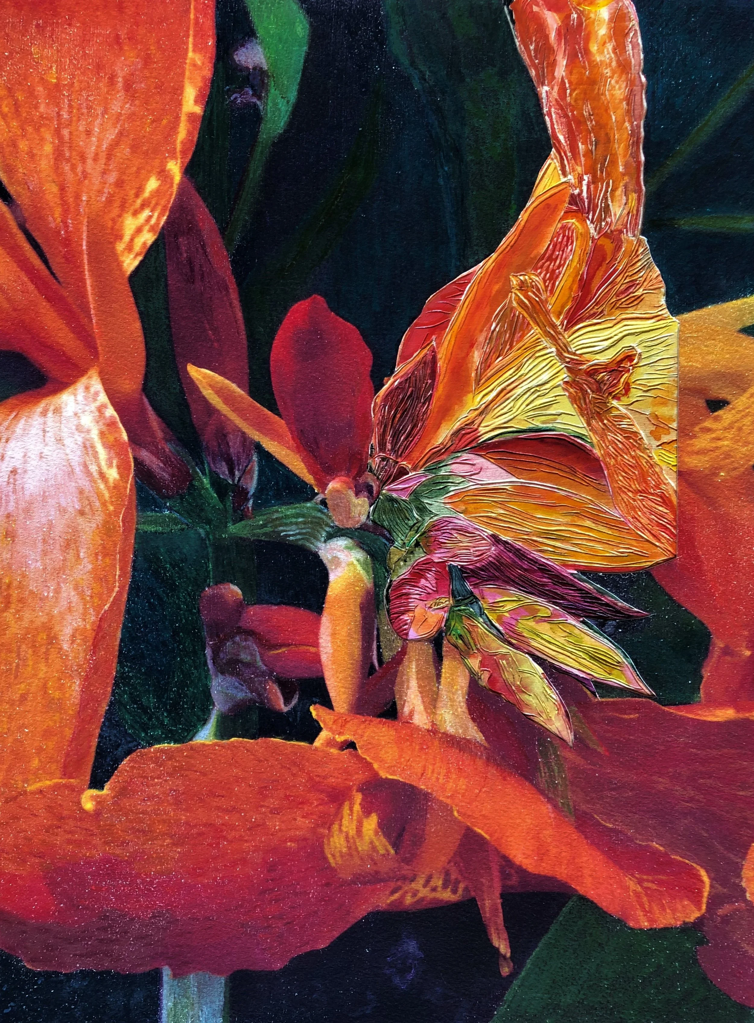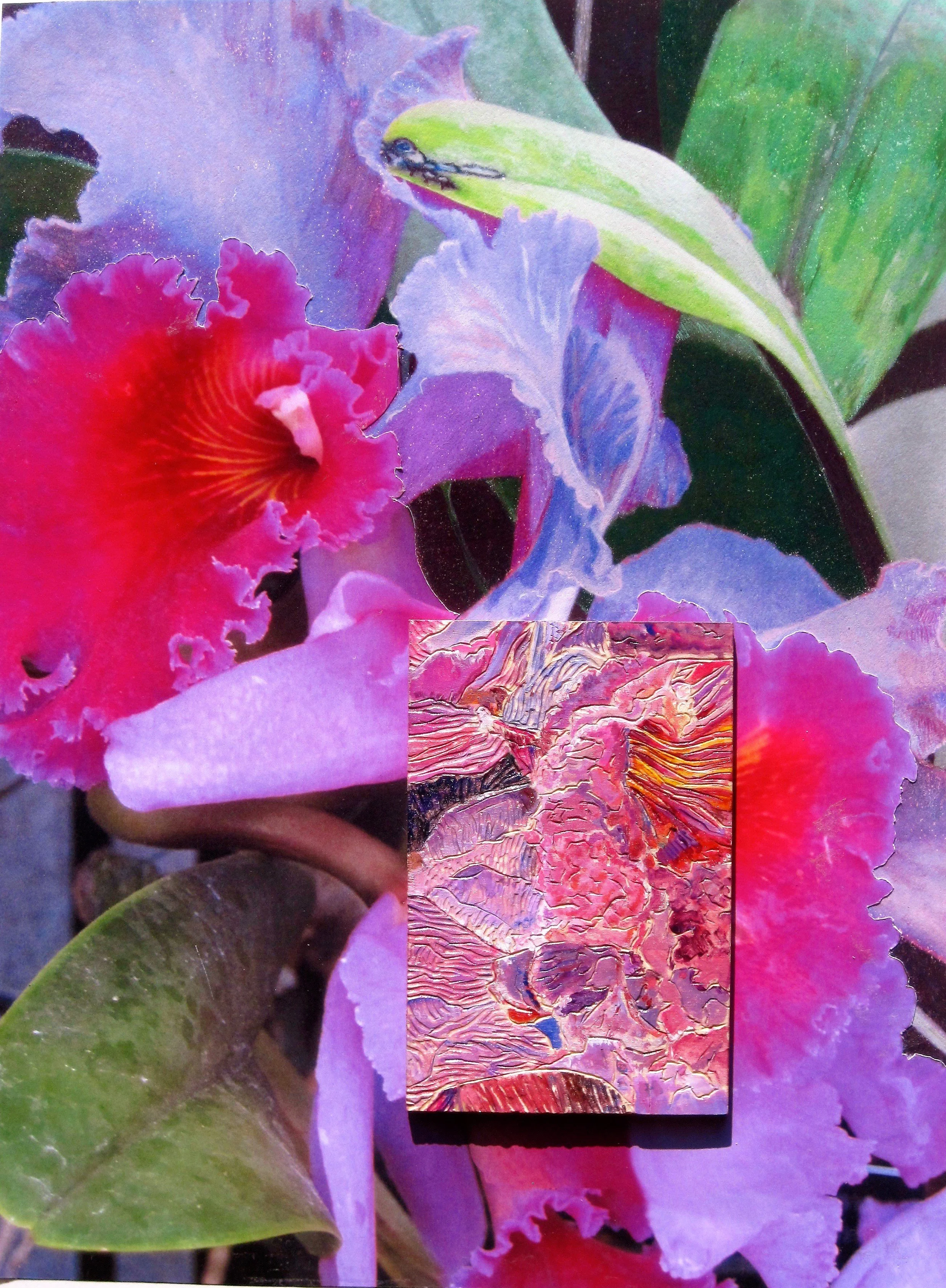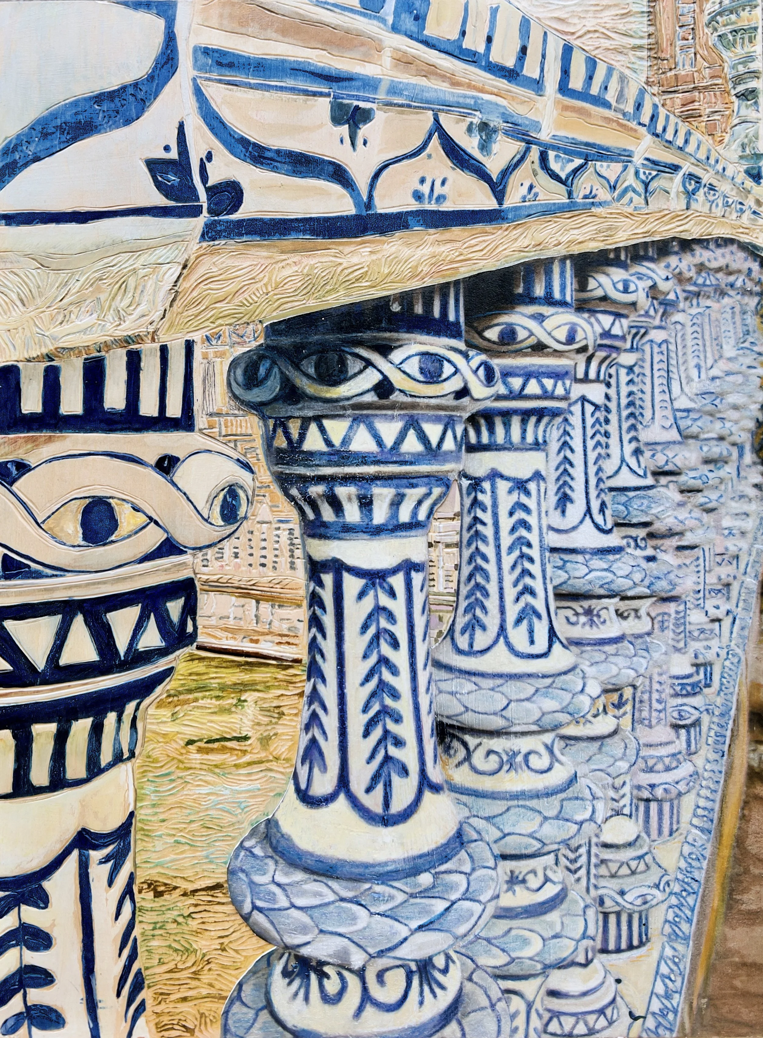 The wood, carved by Bikoff, who focuses on fine detail and texture. Lesser continues with layers of acrylic glazes, alcohol inks, and colored pencils. Mixed media photo transfers are frequently integrated into the relief.