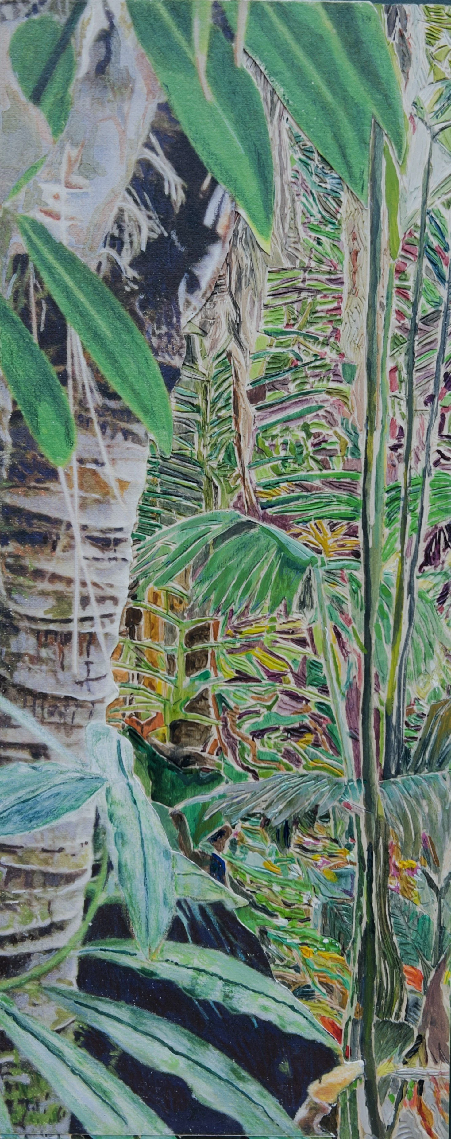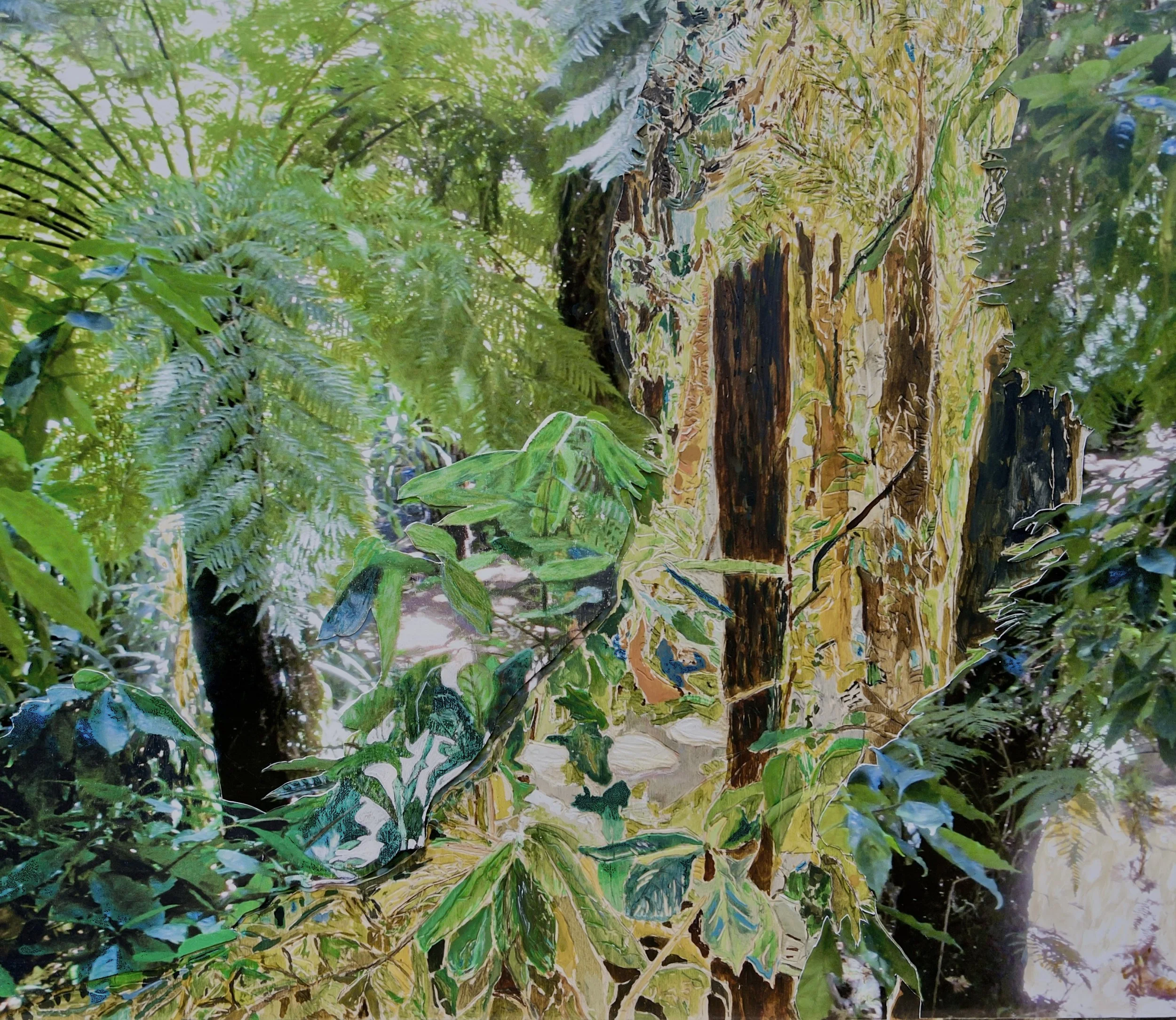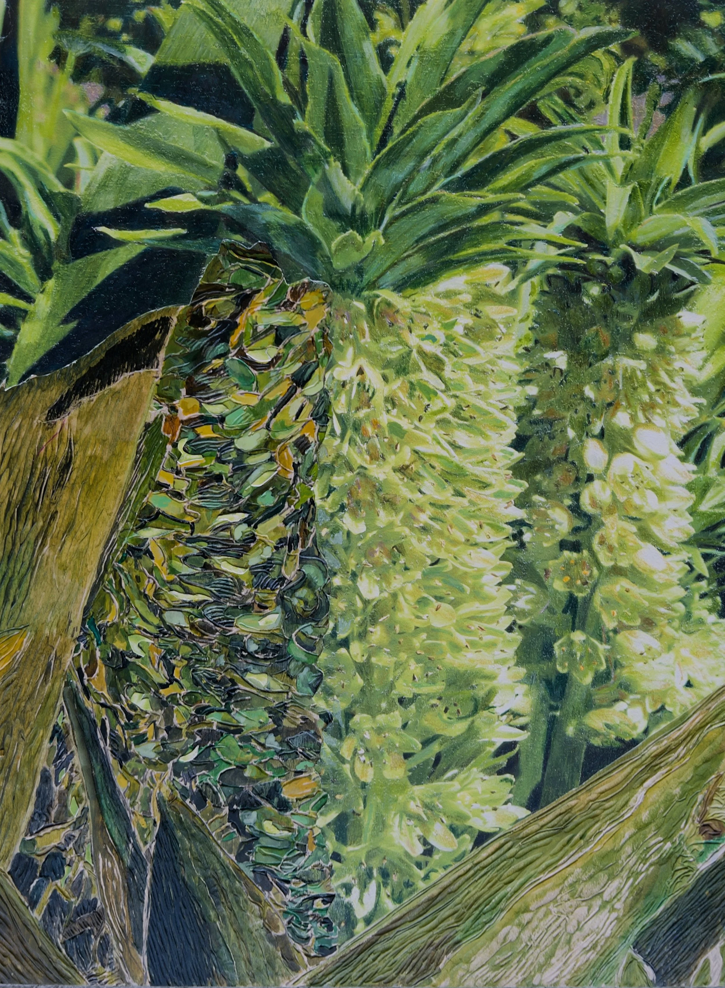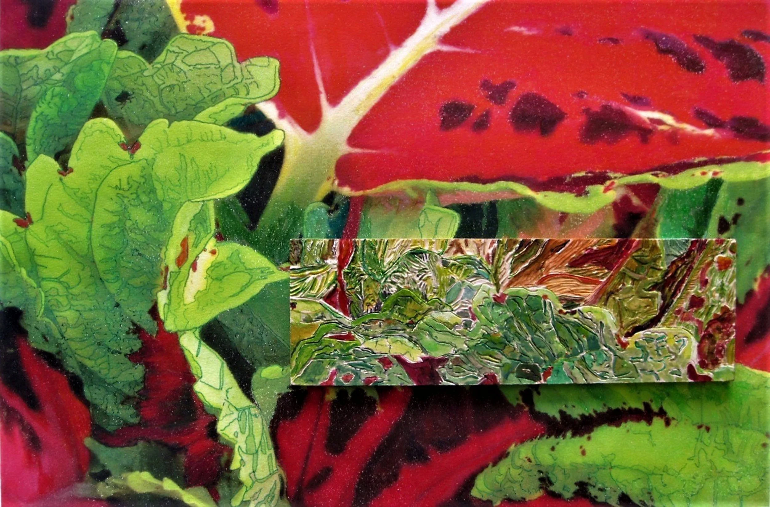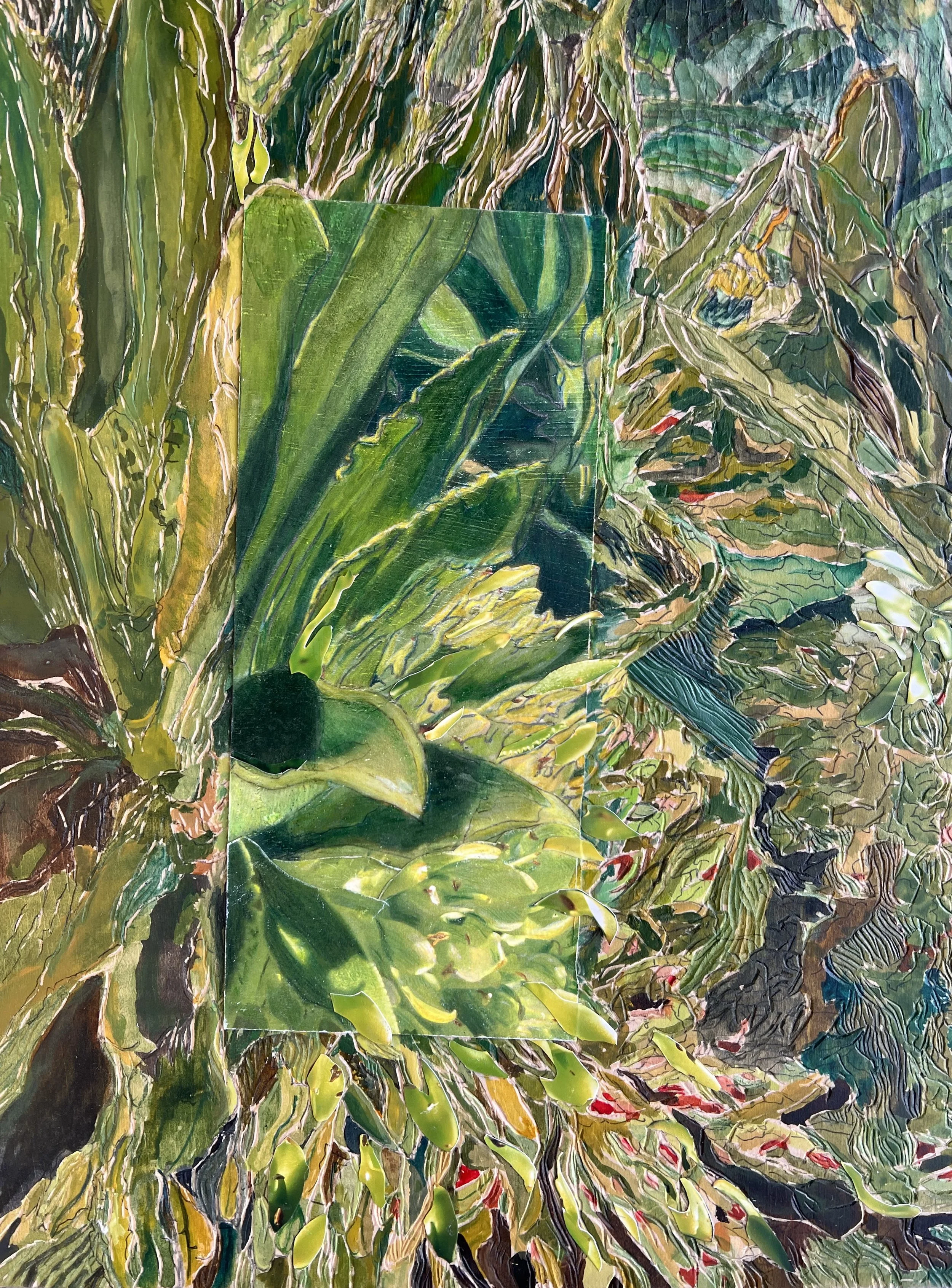 This exhibition presents the collaborative woodcarvings by Sue Bikoff and Harriet Lesser, merging traditions of printmaking and painting in richly layered reliefs. Imagery develops from photographs and preparatory drawings of tropical vegetation.