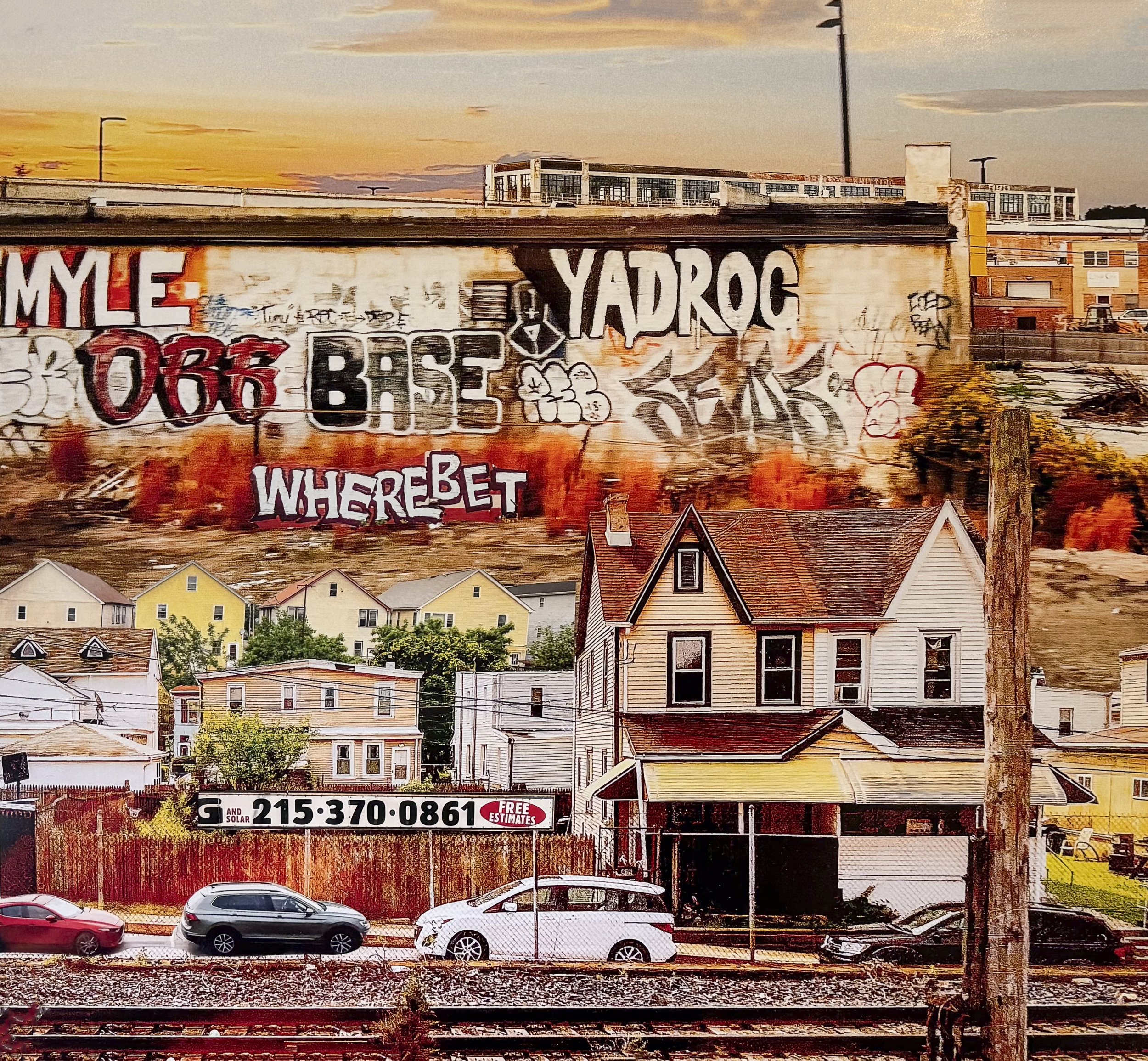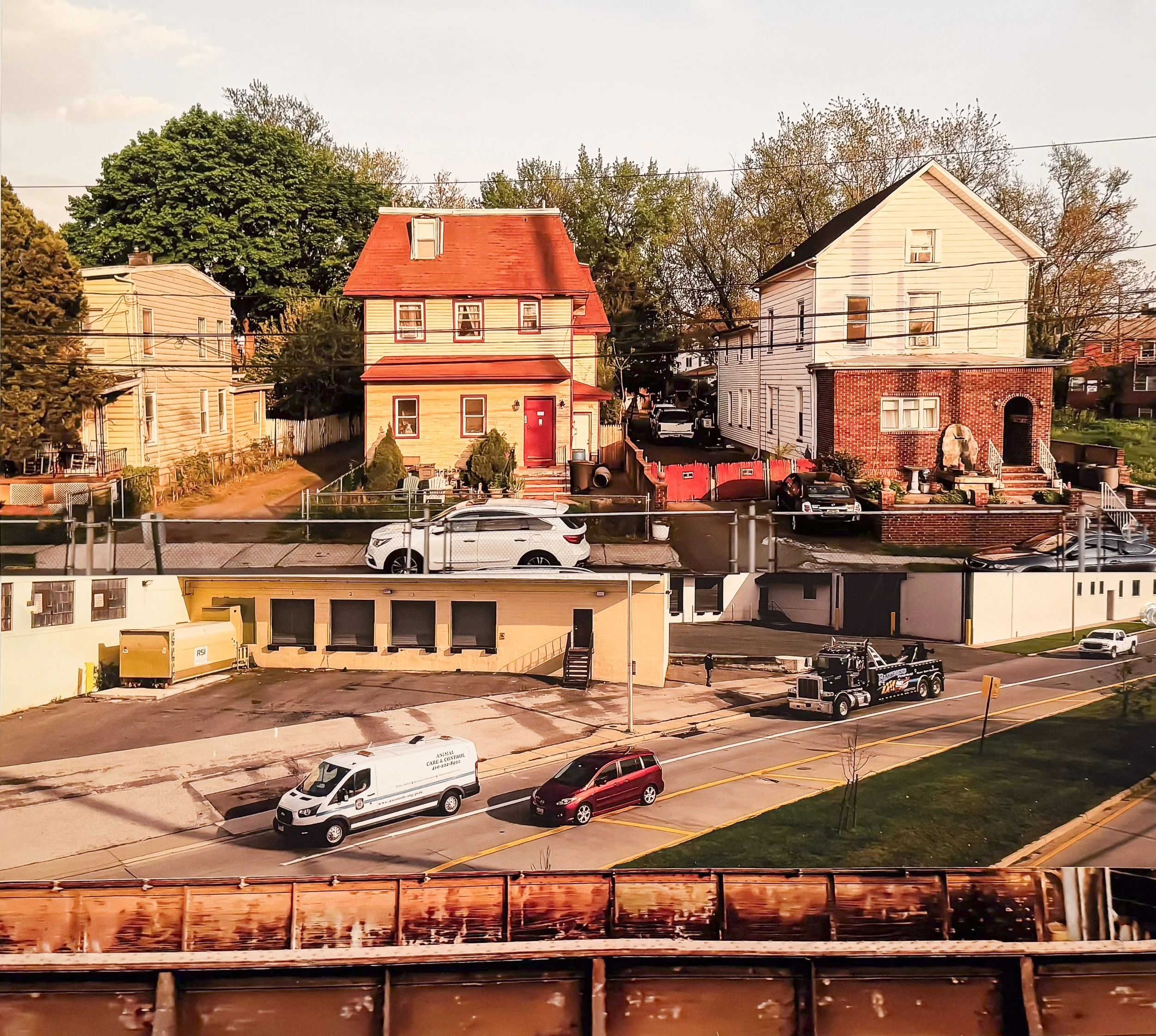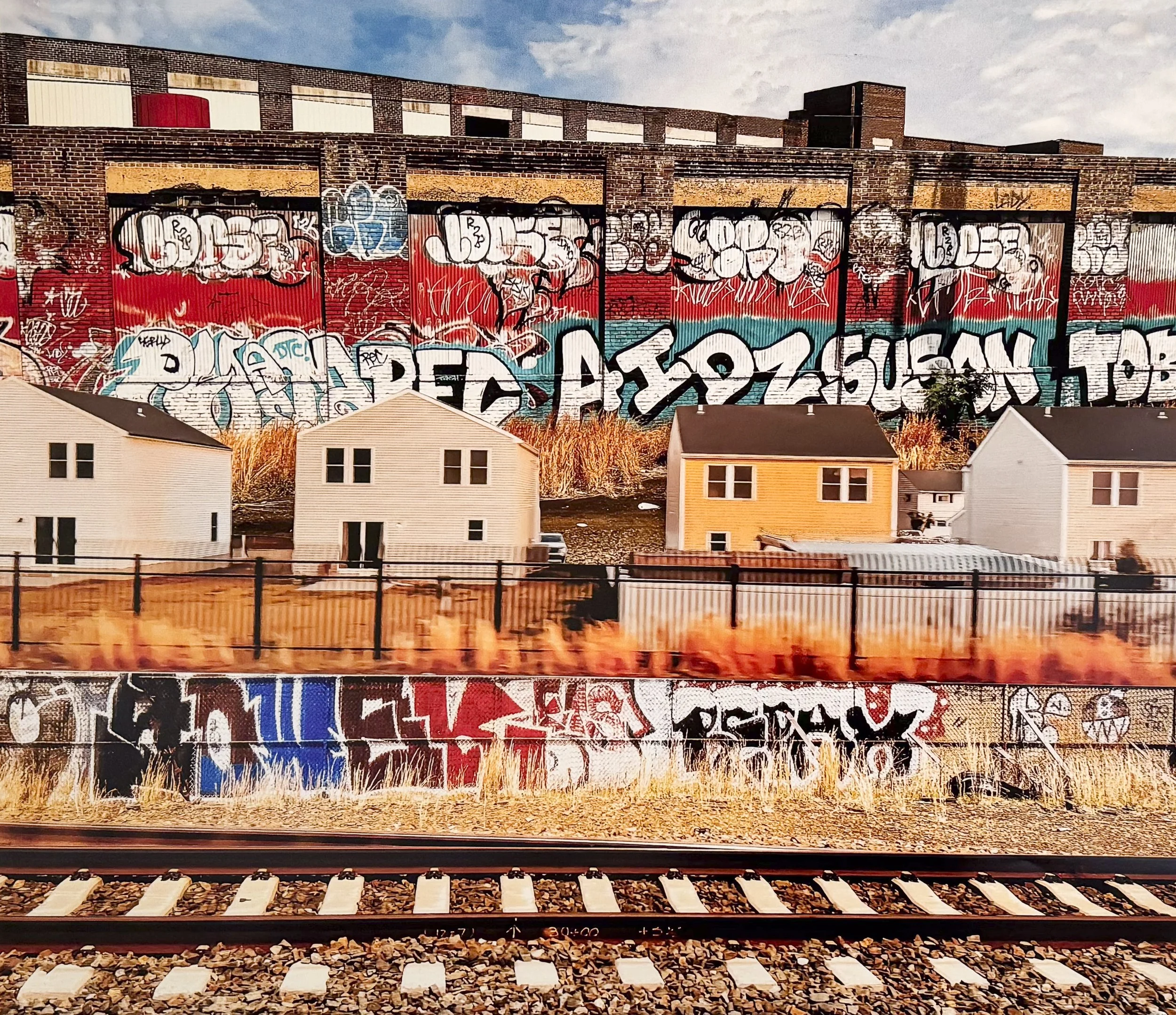 As the train speeds sixty or seventy miles an hour, I can only grasp snippets of what lies outside my window much like images in a dream. To replicate that sensation, I print my photographs, combine images, cut out buildings, houses, graffiti, and piece the segments together in collages. My goal is to tell a story of contemporary America.
