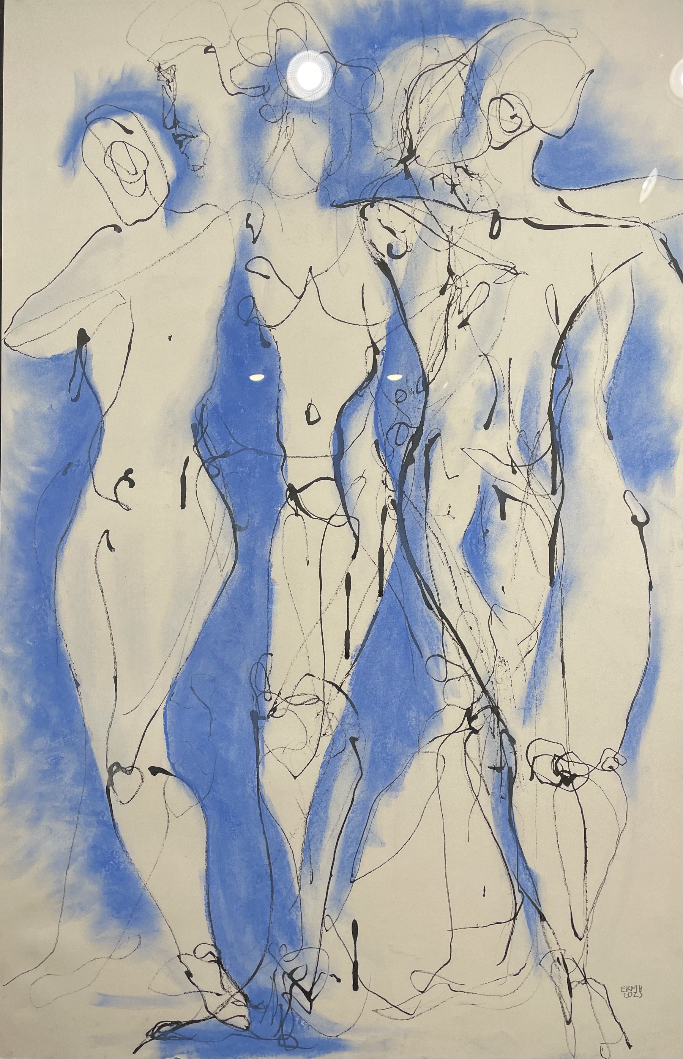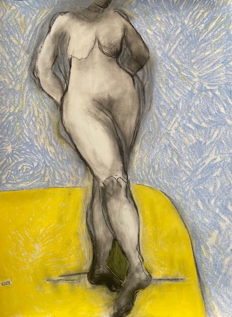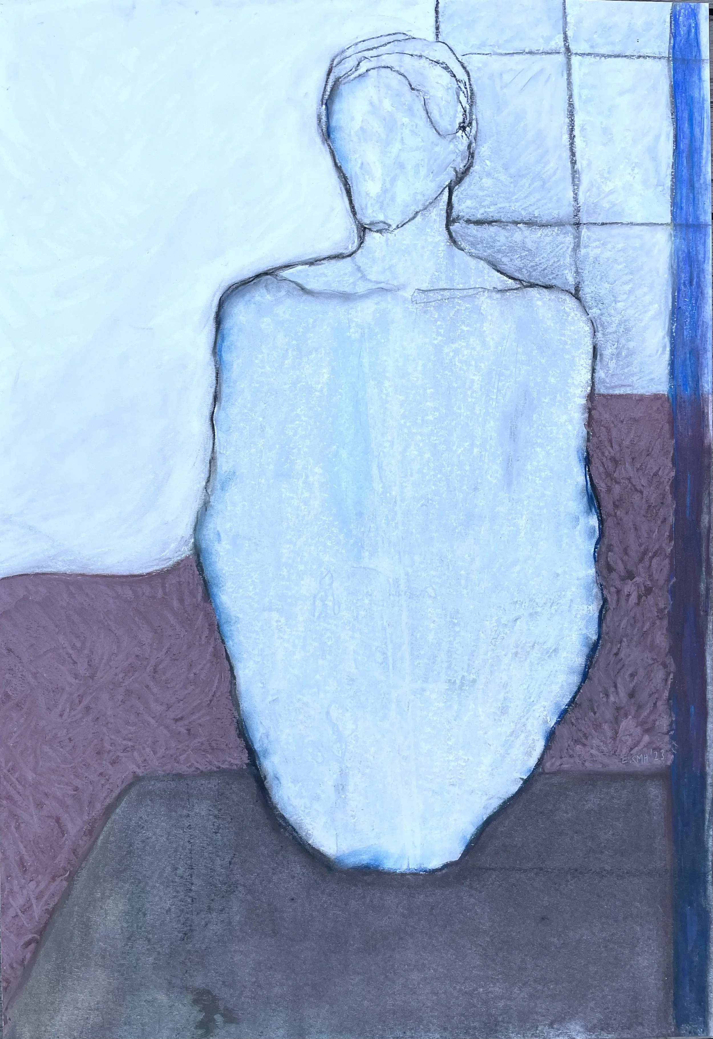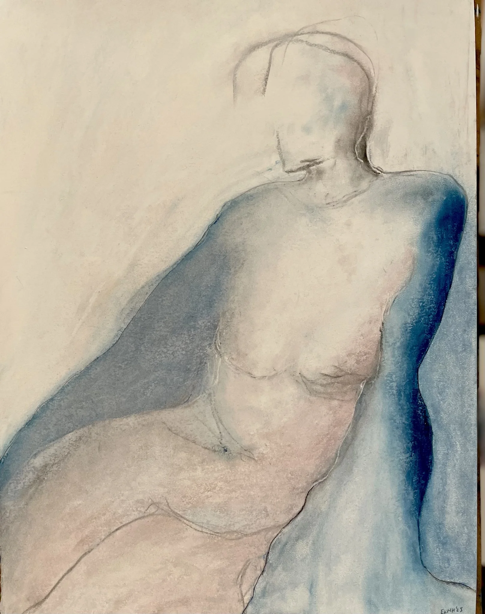Using either charcoal or a wooden coffee stirrer dipped in Japanese sumi ink, the line drawings that form the basis of these pieces are executed quickly yet meditatively. Creating them is as much about being poised in the moment as it is controlling the ink or charcoal on the page. Color is added later using chalk pastels.