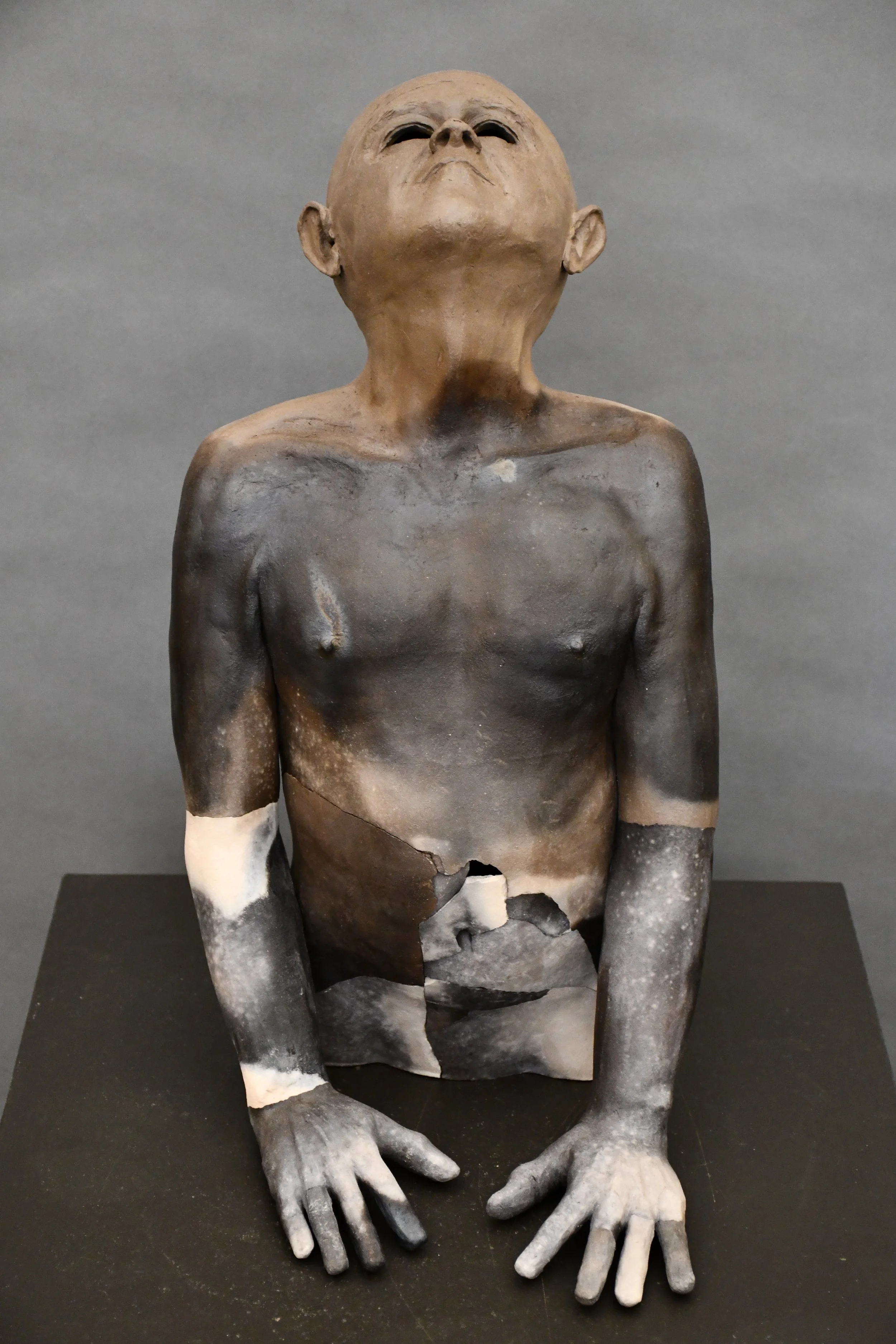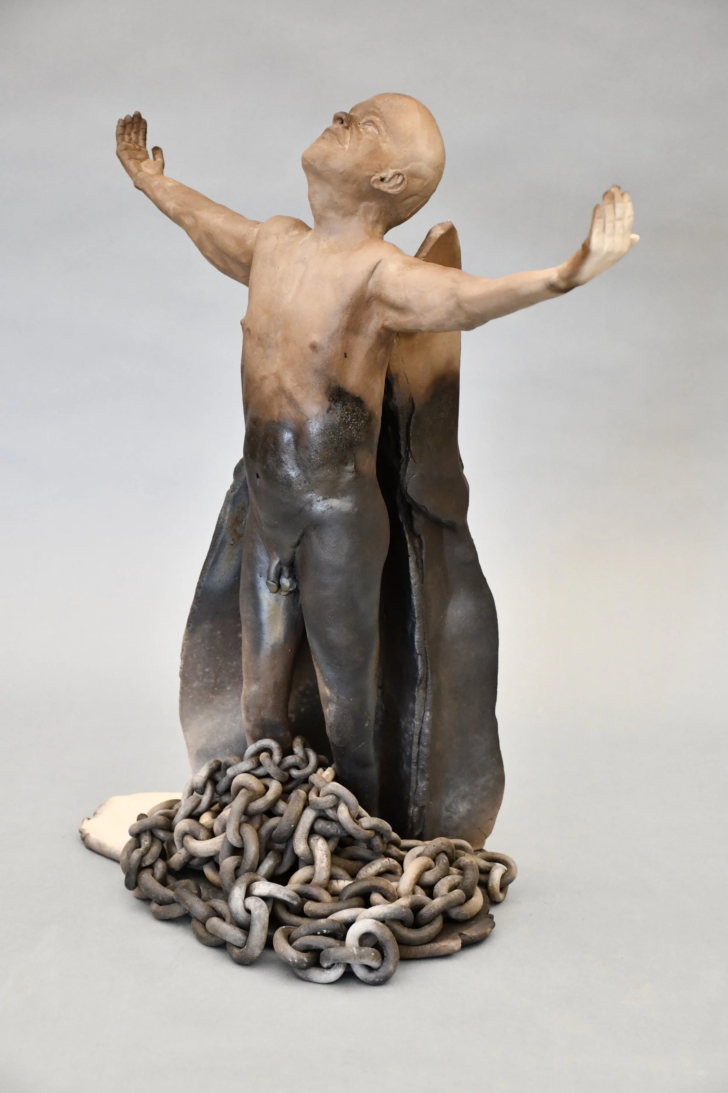The final piece in my interpretation is Up From Brokenness. I told Corson that in this narrative, I believe that the fractures on the figure’s stomach comes from the chains in Into Sunlight. They are scarred by the things that hurt them, but they are ready to begin anew. The figure is looking up, and it feels as if the sun is shining right on them. They are letting themselves be a part of this world, no longer hiding from it.