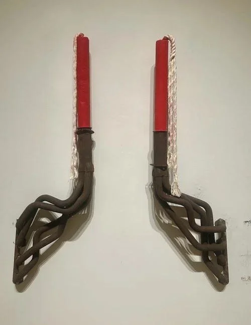 Two wall-mounted entries play, at least partially, on Feuer’s religious heritage. “My Dad’s 10 Commandments of Goaltending,” rendered in metallic watercolor and ink, takes the popularly accepted shape of the tablets supposedly given to Moses on Mount Sinai. Equally playful is a large pair of Shabbat candles made of red wax and mounted on candlesticks fashioned from rusted exhaust intake-manifold pipes from a car or truck. Like a caterpillar, but knowingly rather than instinctively, Feuer seeks transfiguration.