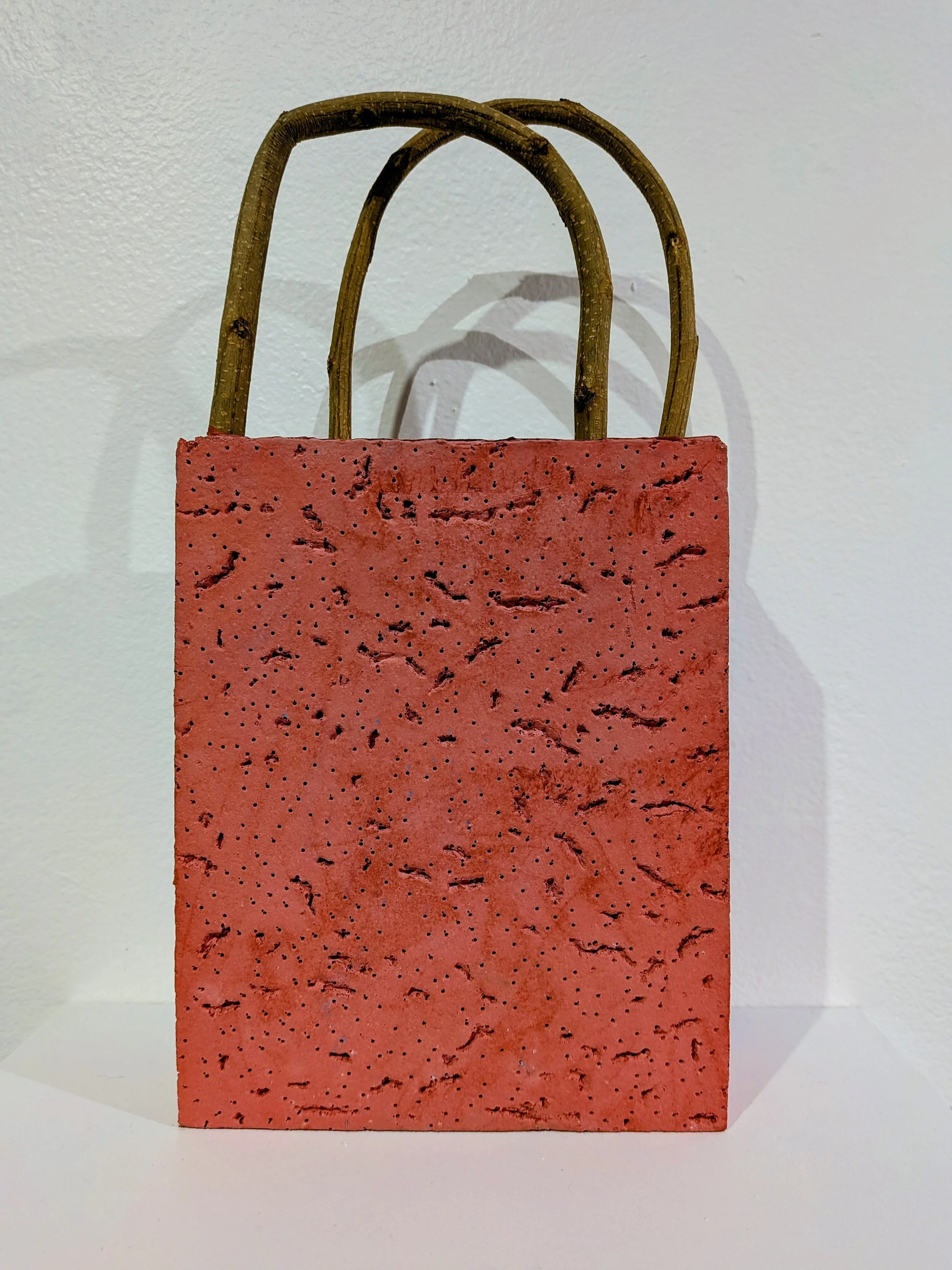The other two contributors are sculptors, although one of them does employ paint. D.C. artist Mary Ratcliff offers small bronzes whose cast tendrils seem to be derived from vines and stalks, but which turn decorative when they meld into the pieces’s attached frames. Sean Sweeney uses concrete, supplemented by wood or wire, to simulate paper. His “BYOB” assumes the shape of a shopping bag, yet it’s made of red-painted concrete and its handles are burly sticks. The cracked surface of the simulated bag adds to a sense of impermanence, but these sleek sacks are clearly a lot more durable than paper. Sweeney, who’s based in Baltimore but has a Washington museum job, subverts familiar forms with incongruous materials, interrupting not painting but expectation.