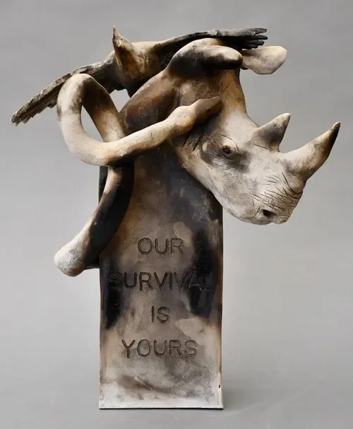 AN IMPRESSIVE SURVEY OF AN OUTSTANDING PROGRAM, “Spirit of Community: Ceramics in Greenbelt, MD” presents 43 pieces by 33 artists associated with the New Deal-founded town’s ceramics group. The selection was curated by Mary Welch Higgins, and the show was organized by Christopher Corson. The latter is a member of Studio Gallery, which hosts the show, and he made one of the highlights, “Our Survival Is Yours.” This pit-fired monument to endangered nature entwines the heads of several animals atop a stele engraved with the piece’s title.