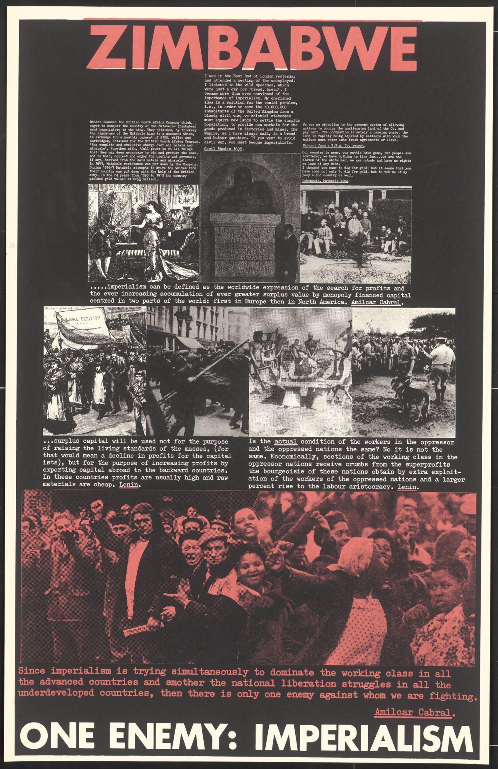The images in the first row are sketches of Cecil Rhodes and other British colonizers followed by captions that include a brief summary of Rhodes’ colonization of Zimbabwe, a quote by Cecil Rhodes on why Imperialism must be enforced, an excerpt from the British South Africa Company on the living situation of the natives, a quote by the Matabele King, Lobengula, and a quote by Amilcar Cabral defining Imperialism. Below that is a row of four images, one drawing and three photographs, each offering a deeper understanding of life under colonial rule, depicting scenes of soldiers and protests. These images are partnered with two quotes by Vladimir Lenin discussing working conditions and the economy. Finally, the third row is a large photograph printed in red ink depicting a passionate protest against Imperialism and colonization by the Zimbabwean people accompanied by a quote from Amilcar Cabral stating “Since imperialism is trying simultaneously to dominate the working class in all the advanced countries and smother the national liberation struggles in all the underdeveloped countries, then there is only one enemy against whom we are fighting.”