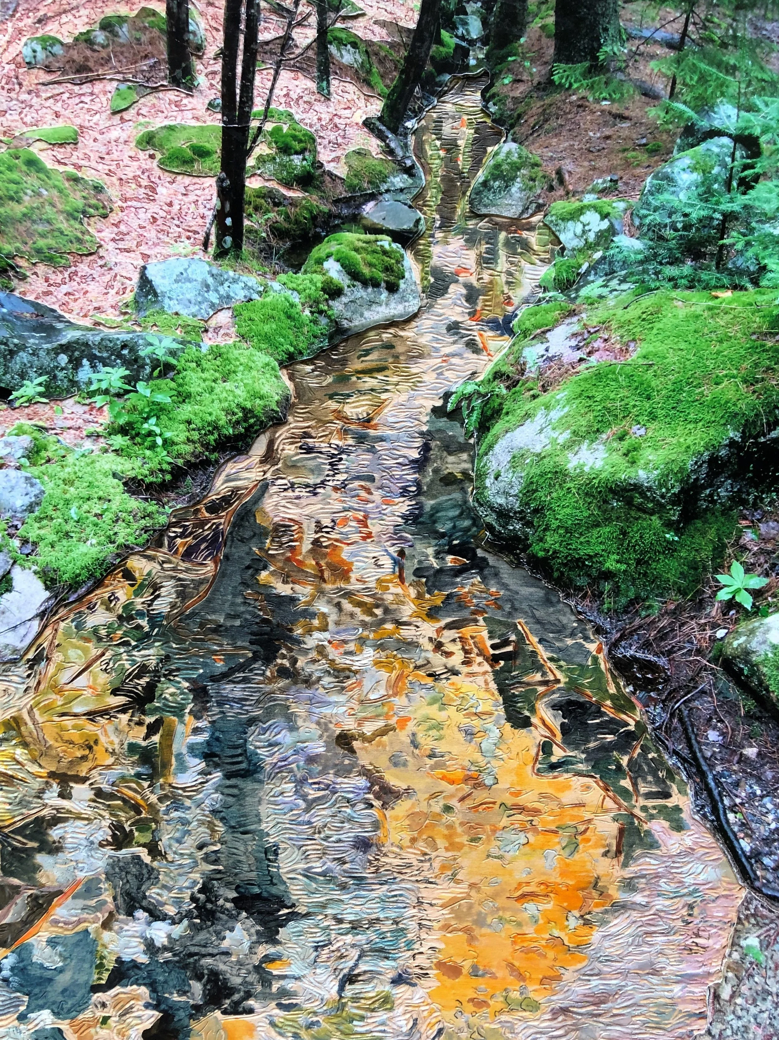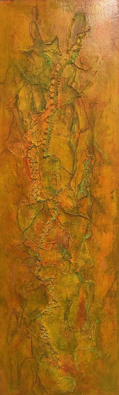 These paintings fulfill an important function for me. It involves creating a piece of art which gives me immense joy and also a means to grapple with the world of never-ending conflicts. The show culminates in a final sculptural painted wood piece reflecting all the colors of my paintings entangled with black wire, tippling and turning, completely unstable and still rising above the fray.