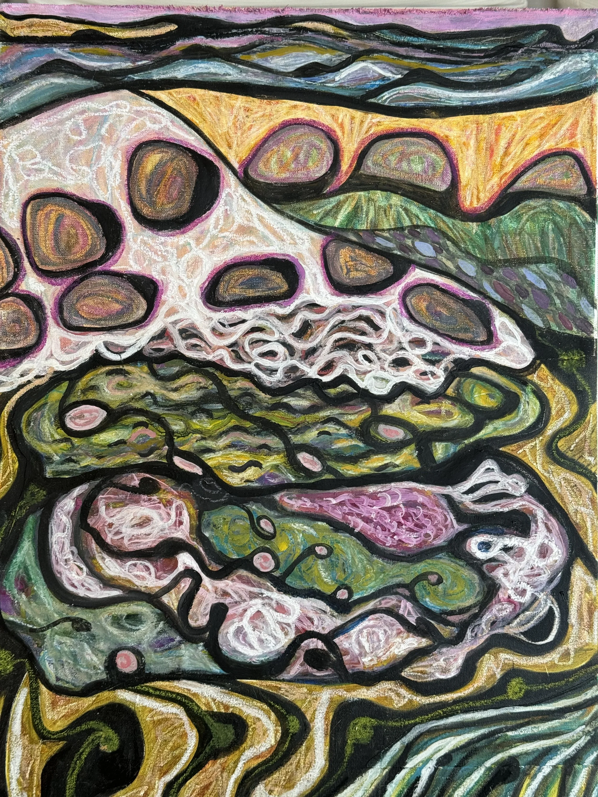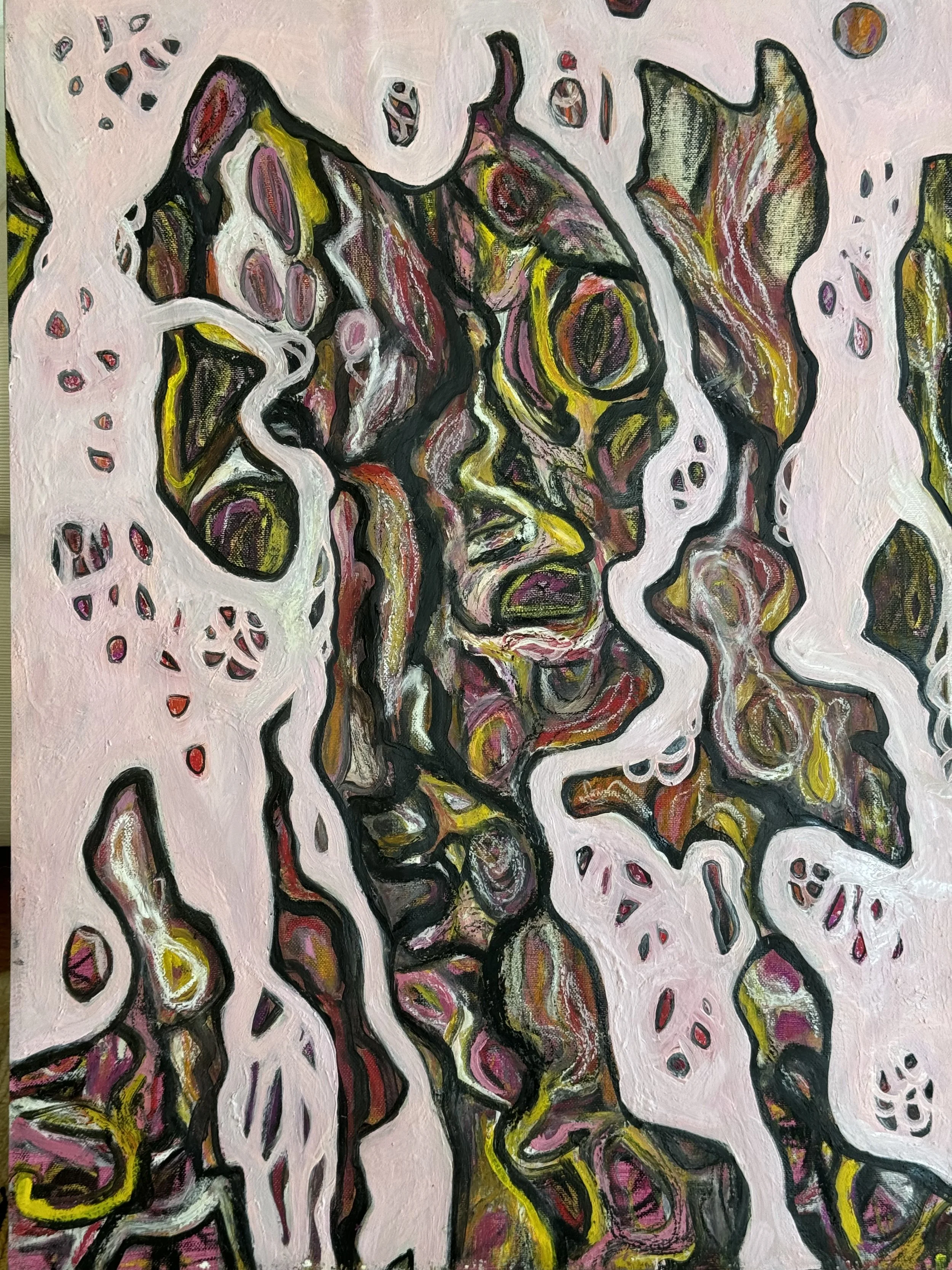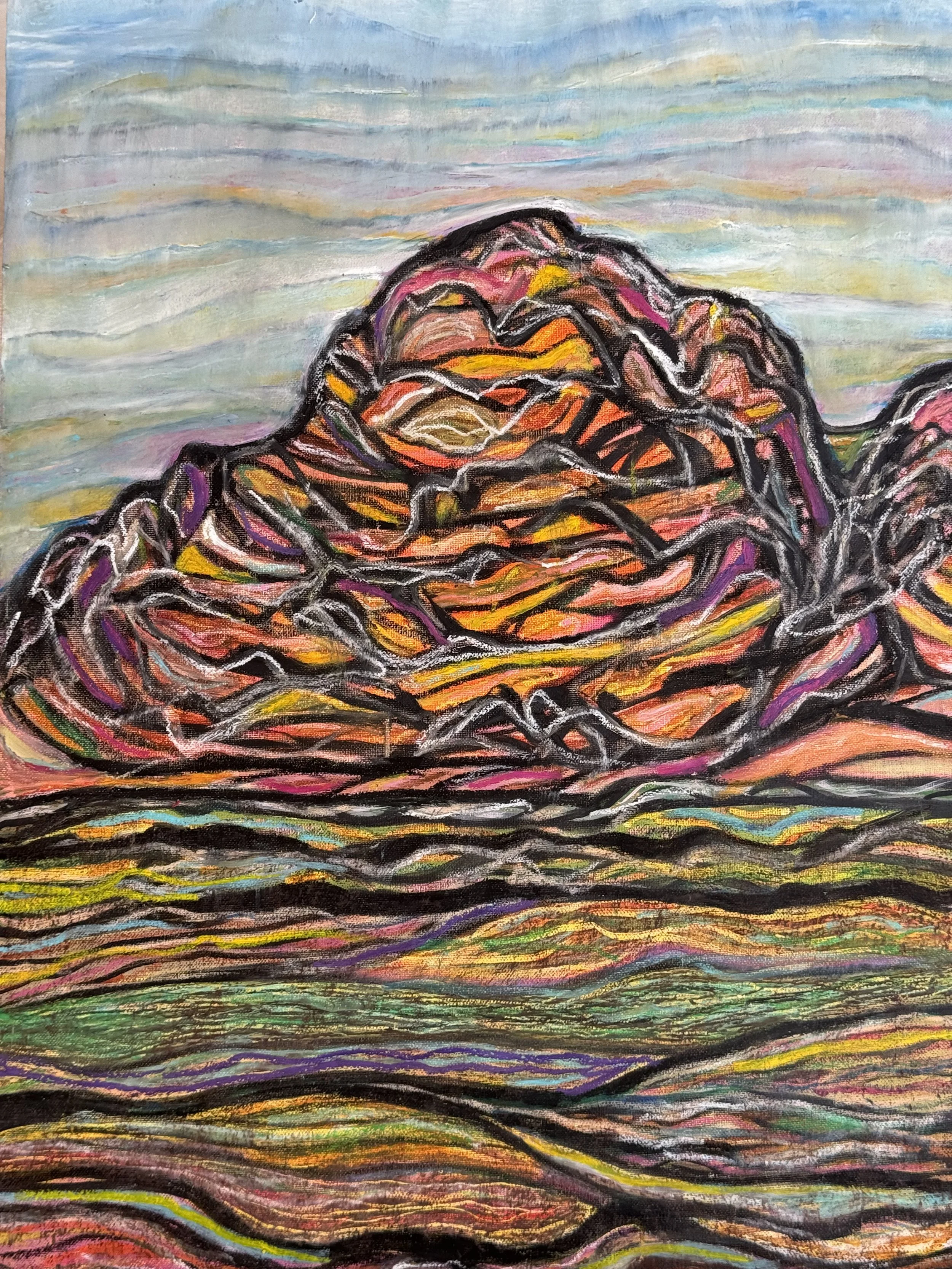 A recent visit to Sedona, AZ, with its almost comic-shaped mountains, reminded me that forms I love to draw really do exist in nature. Though I usually eschew landscapes, the sandstone projectiles and puddled concretions that surrounded me forced my hand. I had to render them in paint since they so clearly spoke my language.