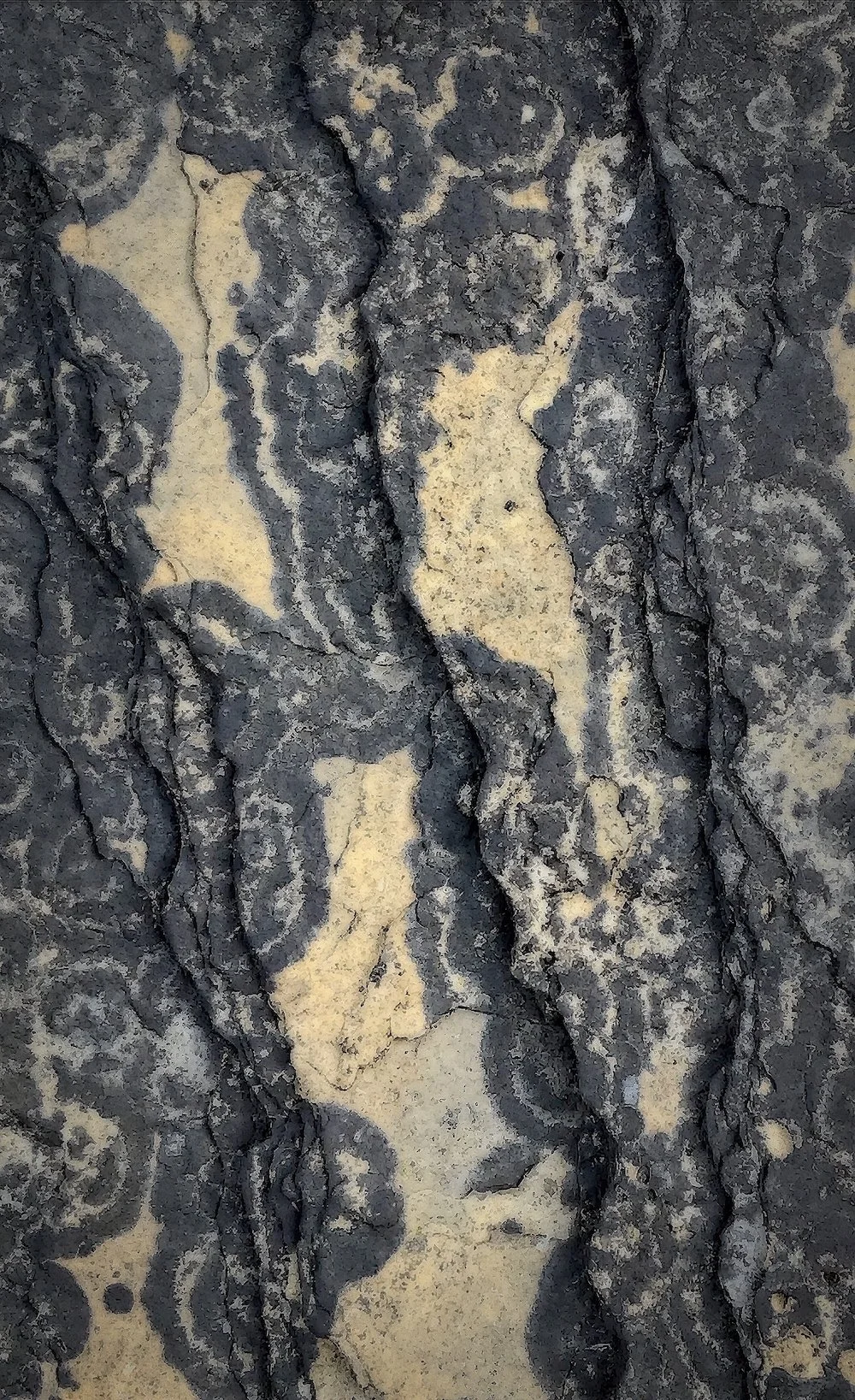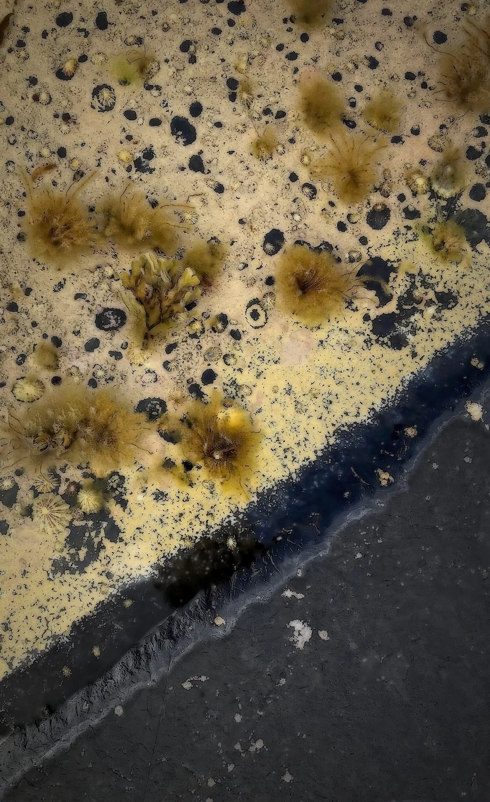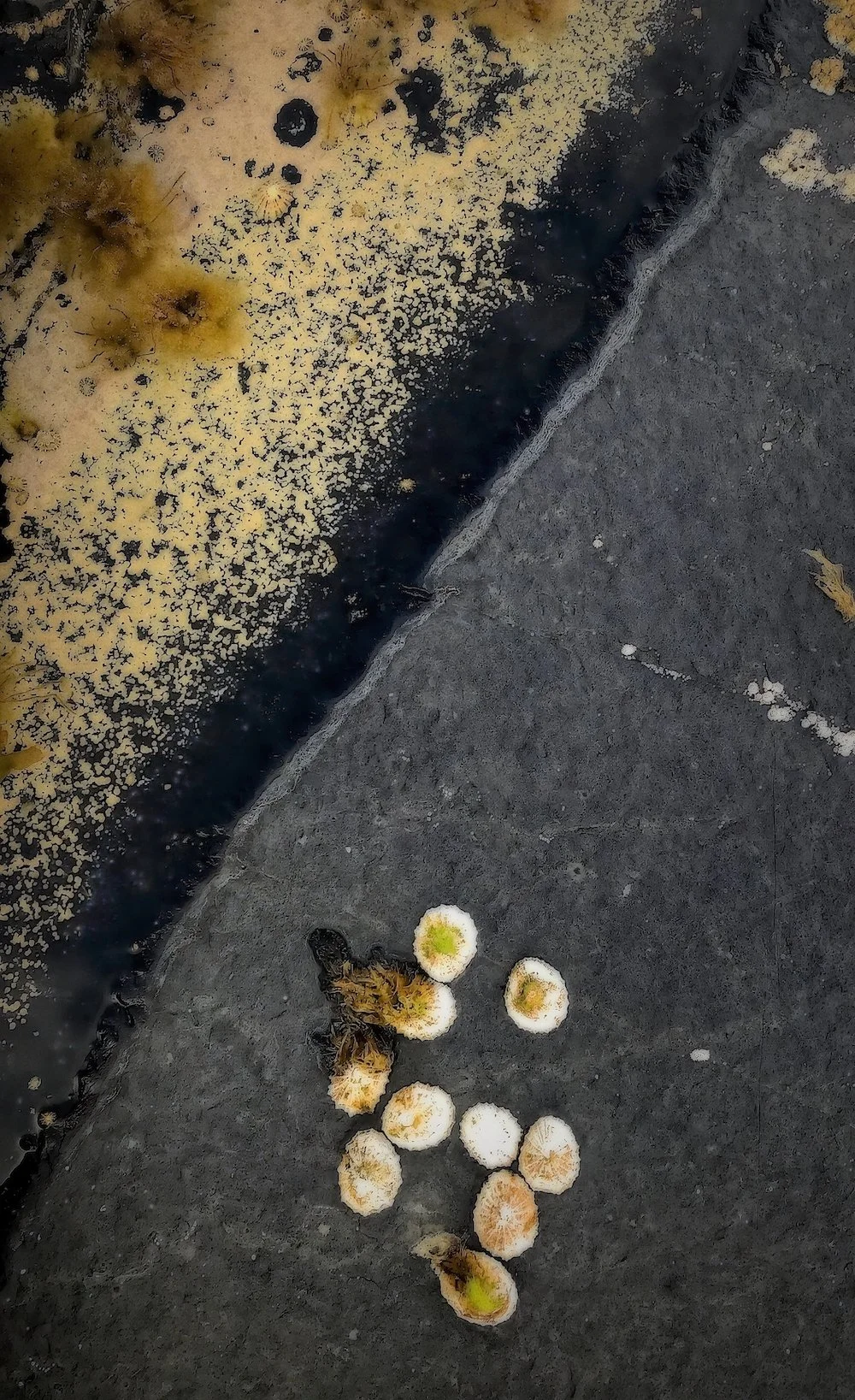 This collection of abstract photographs celebrates the patterns, textures, and colors of weathered sandstone rocks standing the test of time on the coast of Scotland facing the north sea. Each image captures a close-up microcosm of the vast, rugged coastline: secret miniature worlds in which lichen grow in elegant patterns clinging to the very rocks they are eroding, and small pools of seawater trapped by the receding tides create temporary habitats for sea plants and creatures. The rock continually wears away, exposing new layers, reminding the viewer that the scene is at once ancient and fleeting. This exploration into the microcosm of the rocky coast serves as a reminder of the wonder and mystery of our macro universe in which only change is eternal.