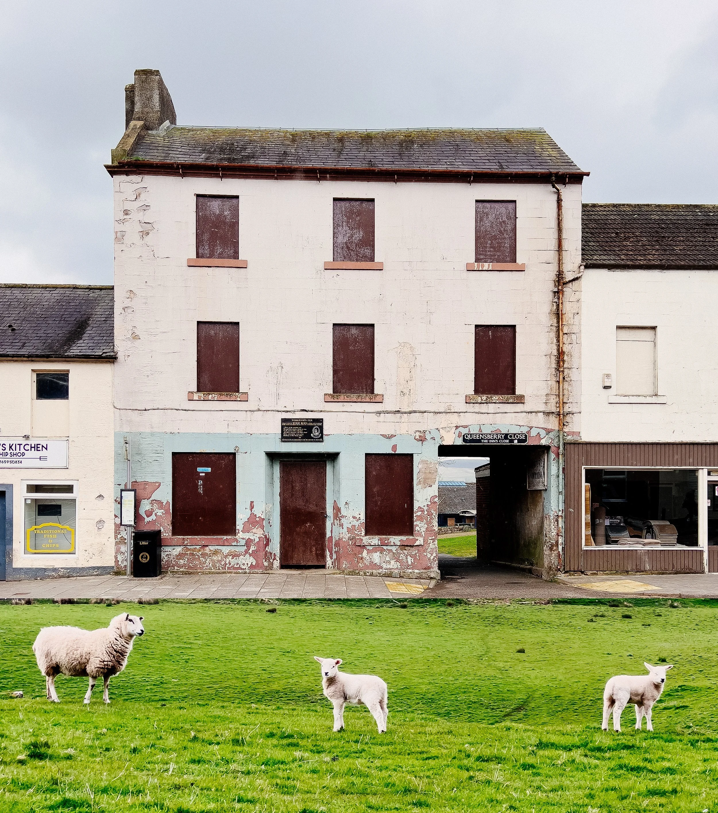 Logan’s work interacts with this dilemma by offering images that at first appear straightforward, yet, something is off. Microcosm and Macrocosm merge: a large window displays nightfall outside a brightly lit cafe; a vast meadow juts up against a village sidewalk; a figure two stories tall stands against a building on a city street.