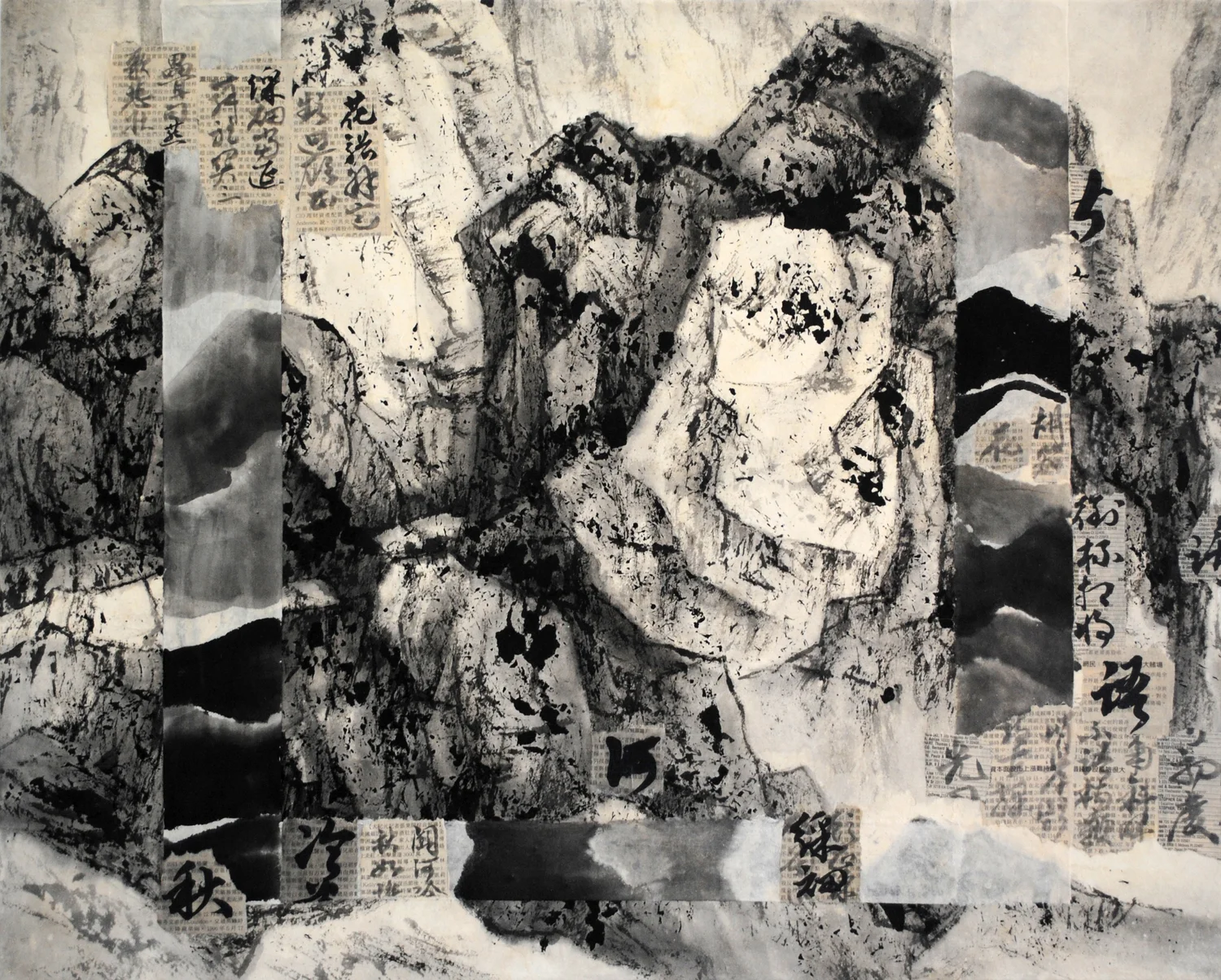 Traditional Chinese landscapes have been modified here in a new dimension with integrating calligraphy and small thumbnails. This multi-layer process is not part of the traditional Chinese painting process. The writings I selected are poems by an 11th century scholar artist Mei-Fu, and some are by my great uncle, Jen Yuan-Tao (1890-1990), a scholar and a general.