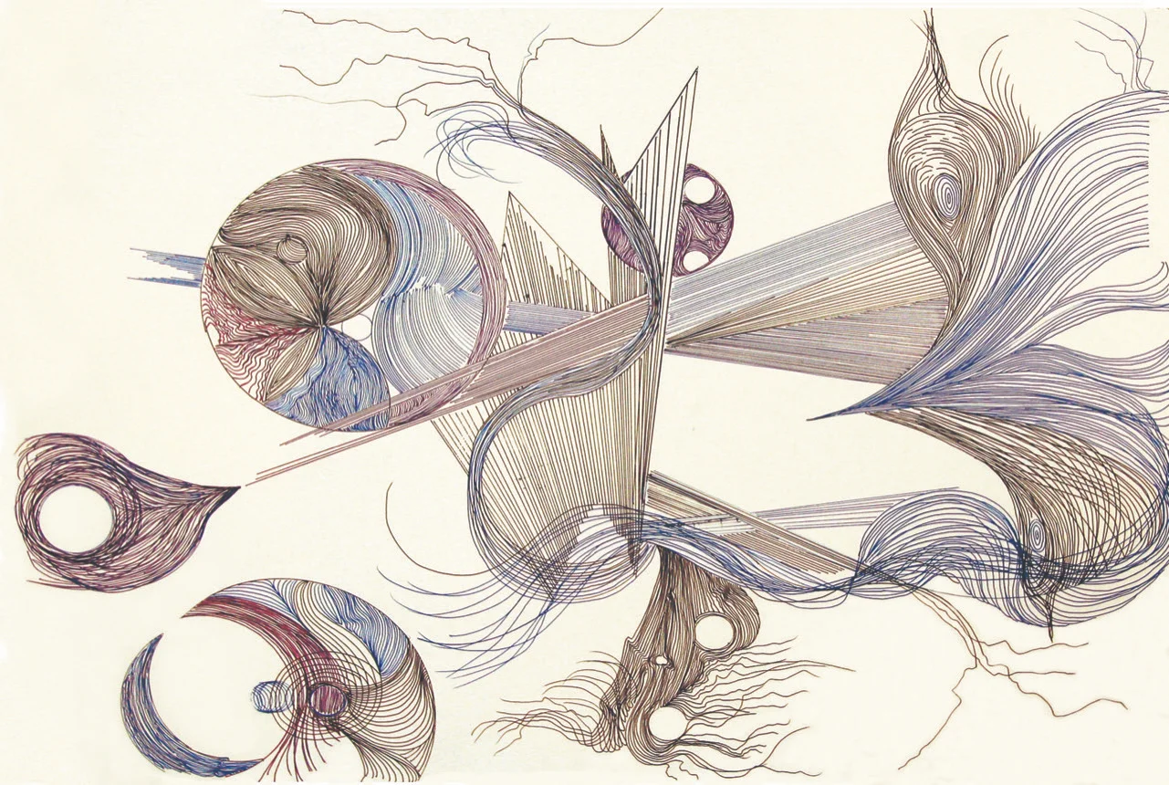 These meditative drawings, completed over the past six months, grew out of the need to focus exclusively on the page, to the exclusion of all other thoughts. The earlier drawings started with a few algorithms: the lines must be parallel and no lines could cross one another; circles and straight edges could be traced but needed to be exact; if a slight deviation occurred, the following lines must be laid down in such a way as to incorporate that deviation. The deviations quickly became obstacles that diverted the flow and those flows began to take on directions of their own. The white parts of the paper began to compete; the pens ran out of ink mid-stream; adjustments needed to be made. Best of all, space began to be created within the two-dimensionality of some of the lines; swirls and eddies appeared and new forms emerged.