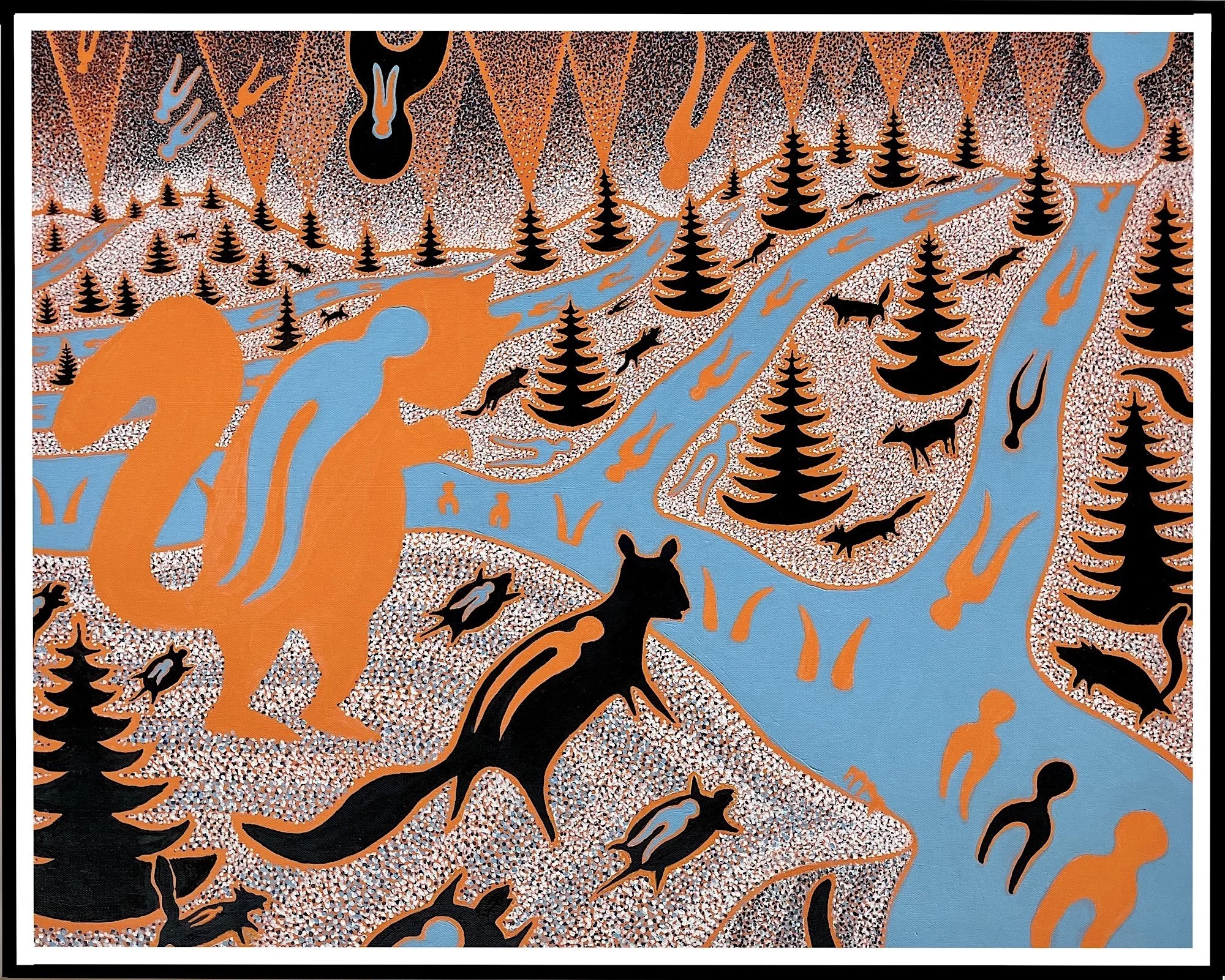 By imagining and projecting the animal’s point of view, Wayne has created paintings of silhouette-like figures and animals inhabiting mythical landscapes of mountains, waterways, and woodlands. Within a sun-drenched pointillistic setting, the beings can be seen flying, floating, and fleeing from an undetermined outcome.