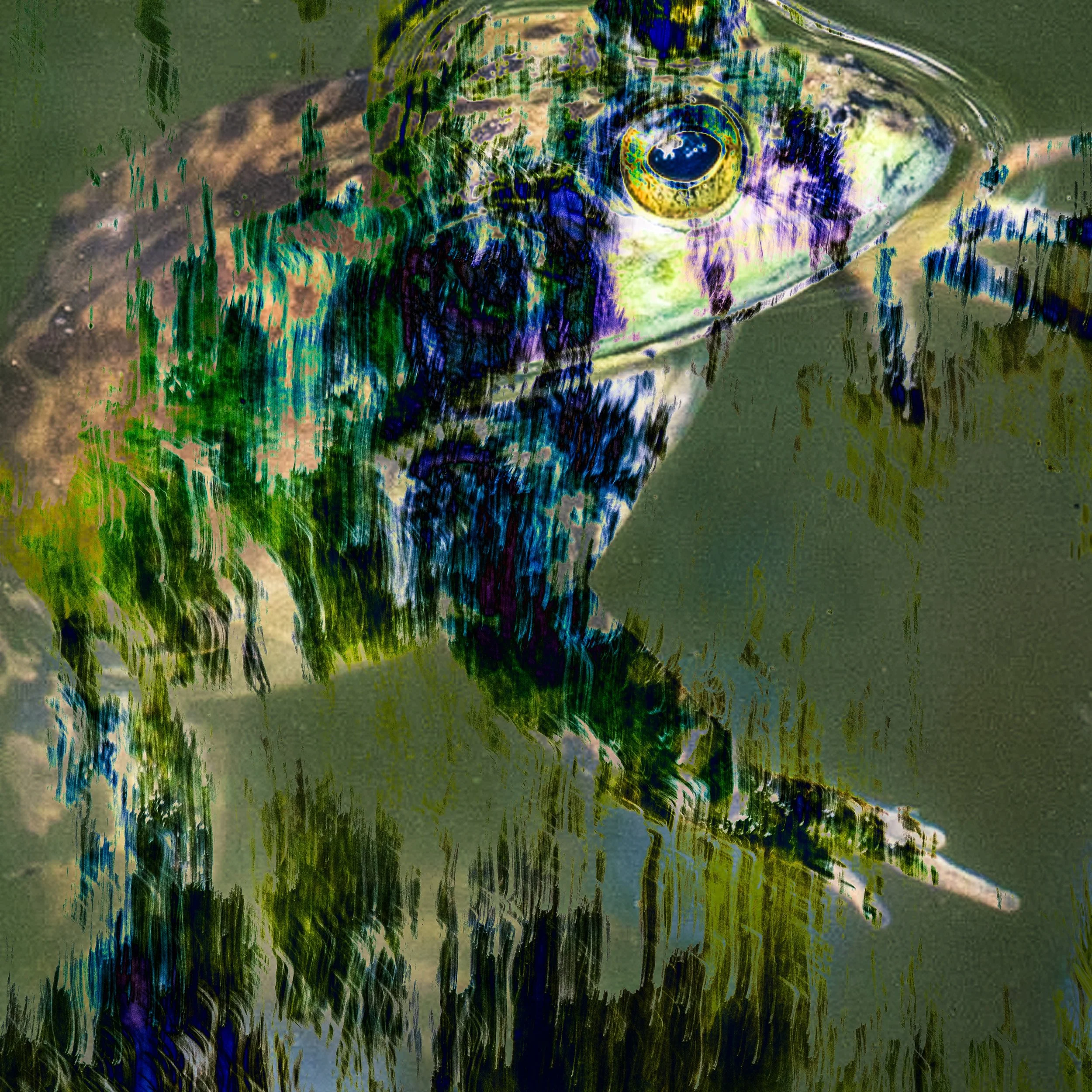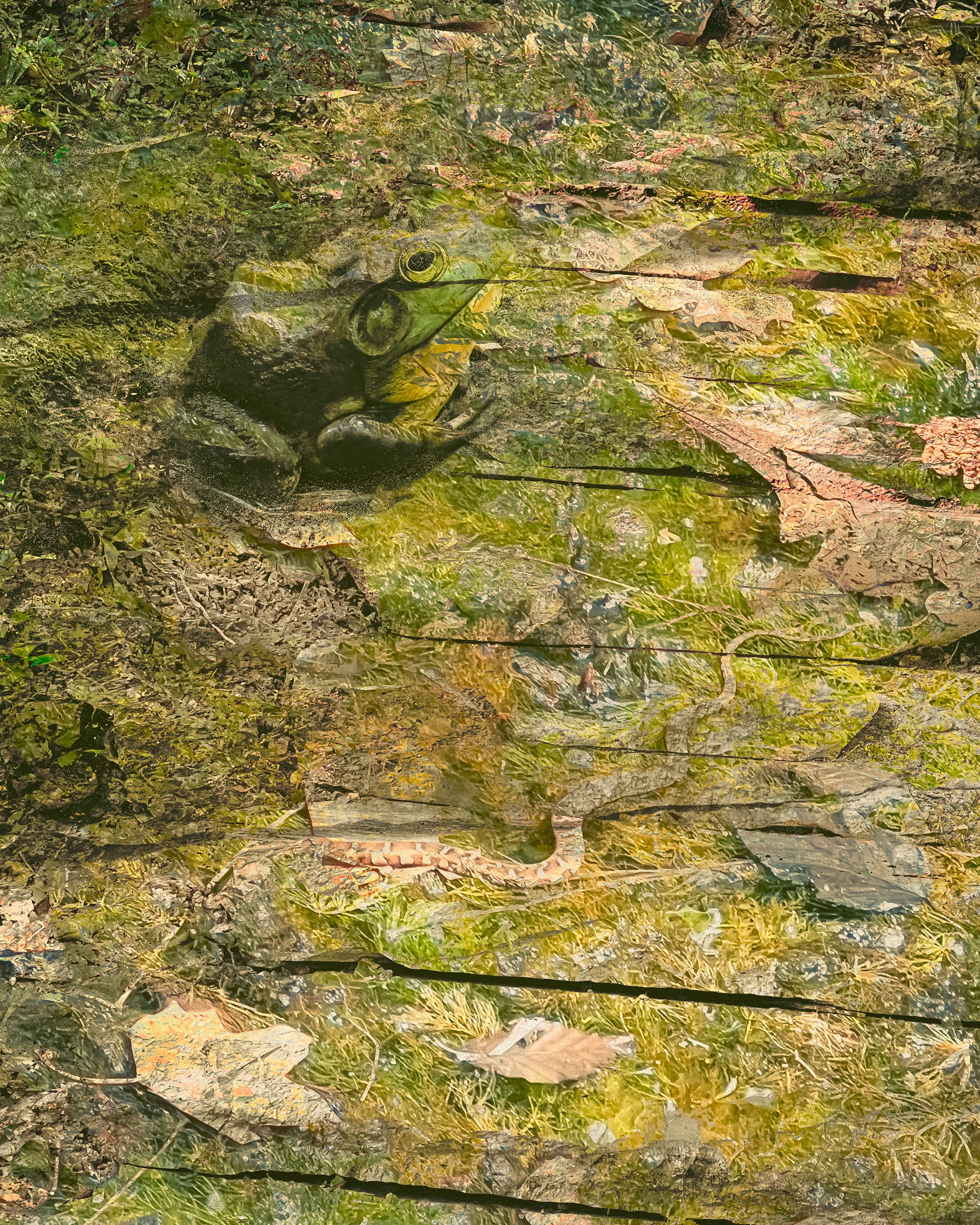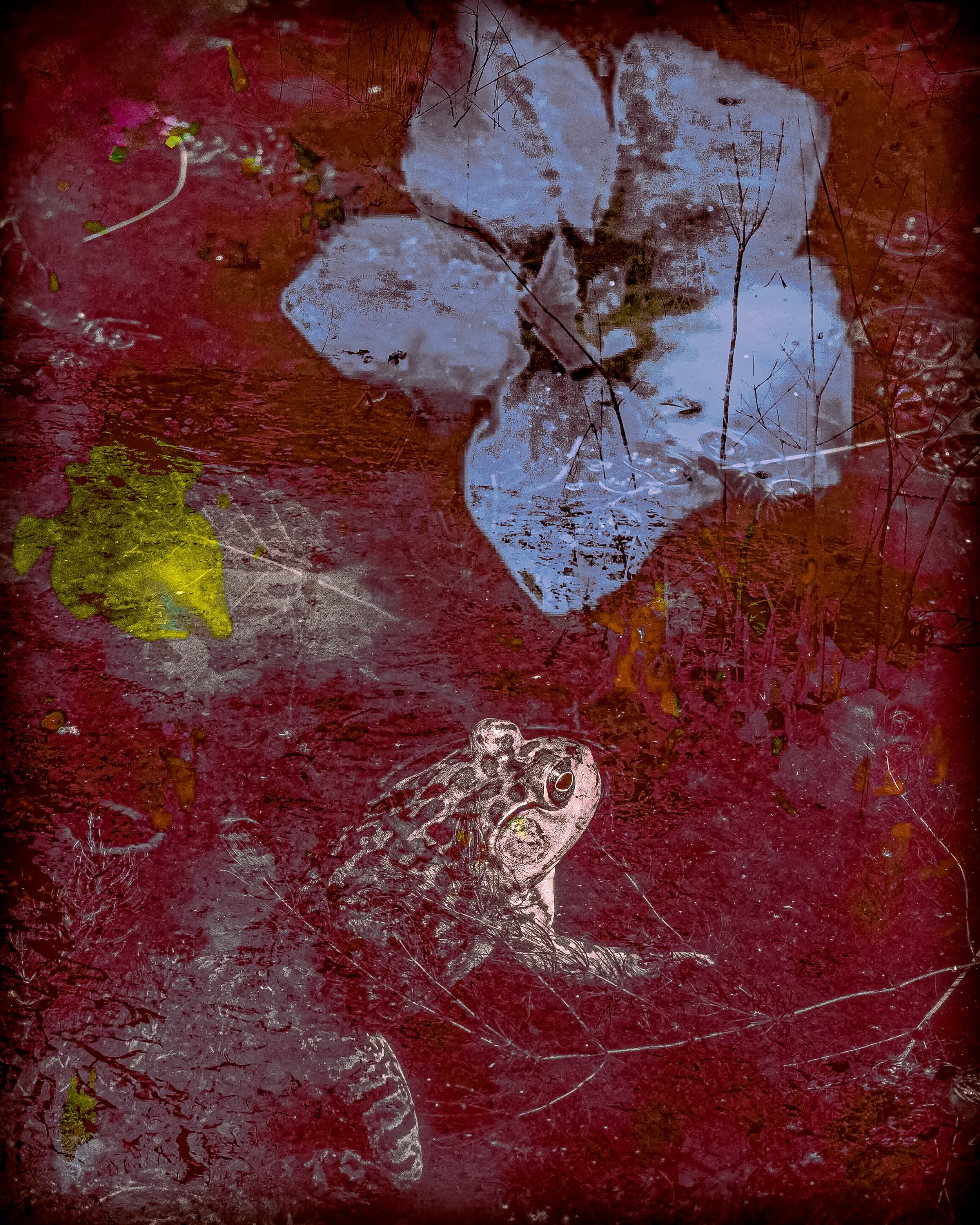 Judy Bonderman’s show (subtitled Transitions) consists of images of aquatic plants, frogs, water snakes, and goldfish inspired by walks through the Tregaron Conservancy. The underlying theme is a retreat, a quiet reflection, an invitation to “Be Still.” Rather than reproducing what the lens sees, Judy exaggerates and romanticizes in her digital interpretations to convey what, for her, lies between reality and abstract fantasy.
