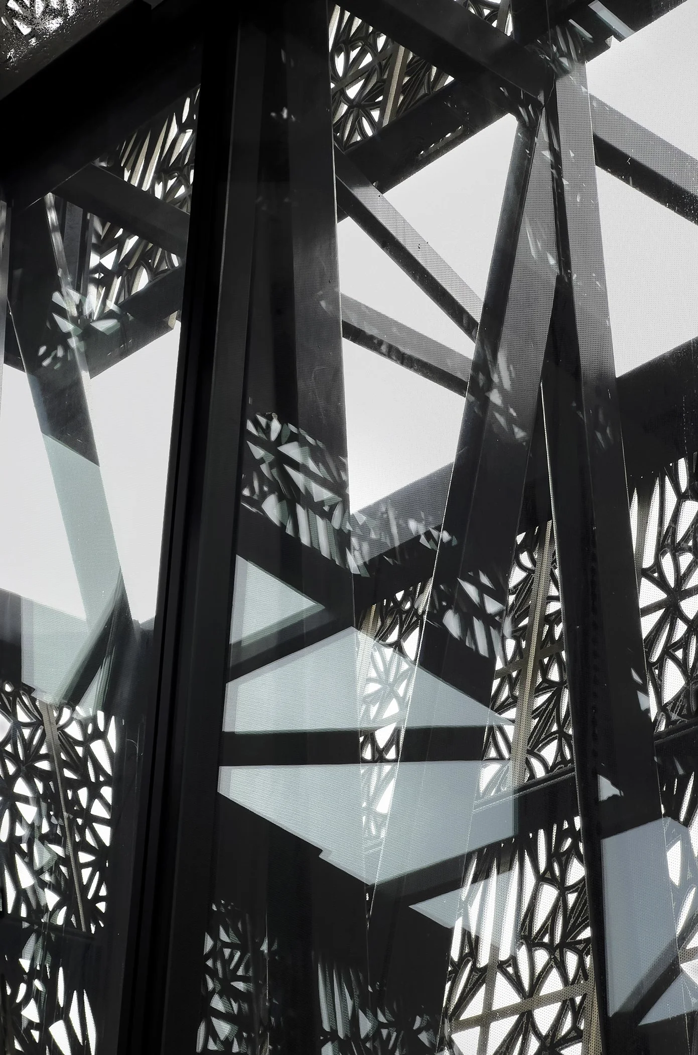 In Jo Levine’s photographs, light fixtures are suspended in the sky, structures float in the air, and lines bend and fracture eerily, creating visual puzzles for the viewer. Although her pictures look digitally manipulated, they aren’t. Her mysterious photos are all reflections – off water, glass, or other shiny surfaces – that naturally distort the scenes they mirror, making them simultaneously real and surreal.