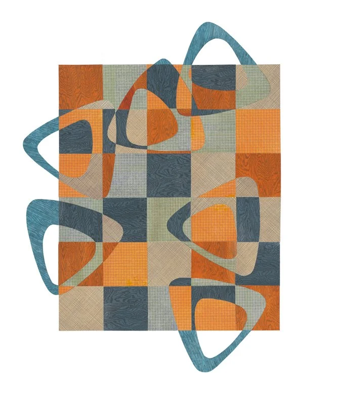 Cwiok’s work begins with geometric compositions, structures from which he is able to depart and stretch the boundaries he has set for himself. His use of collage is a way to combine and incorporate real world experience and to achieve a sense of poetry with a visual narrative. He employs collage as content and as compositional elements. The use of everyday objects of communication such as security envelope designs, tickets stubs, announcements, and personal ephemera provide a wealth of tangible material. These remnants of life are place markers and reminders of past experiences that allow a depth of emotional significance and as well as poignant memory. His work is an additive process, constructed piece by piece in the manner of marquetry, resulting in a single layer of intricate parts that constitutes the visual field.