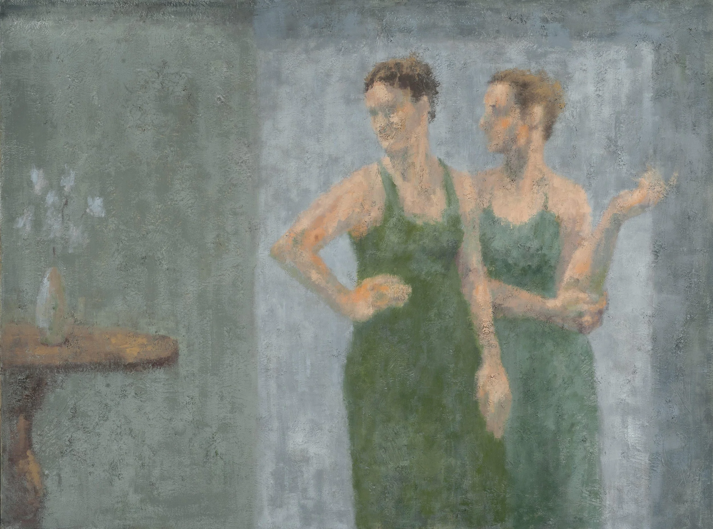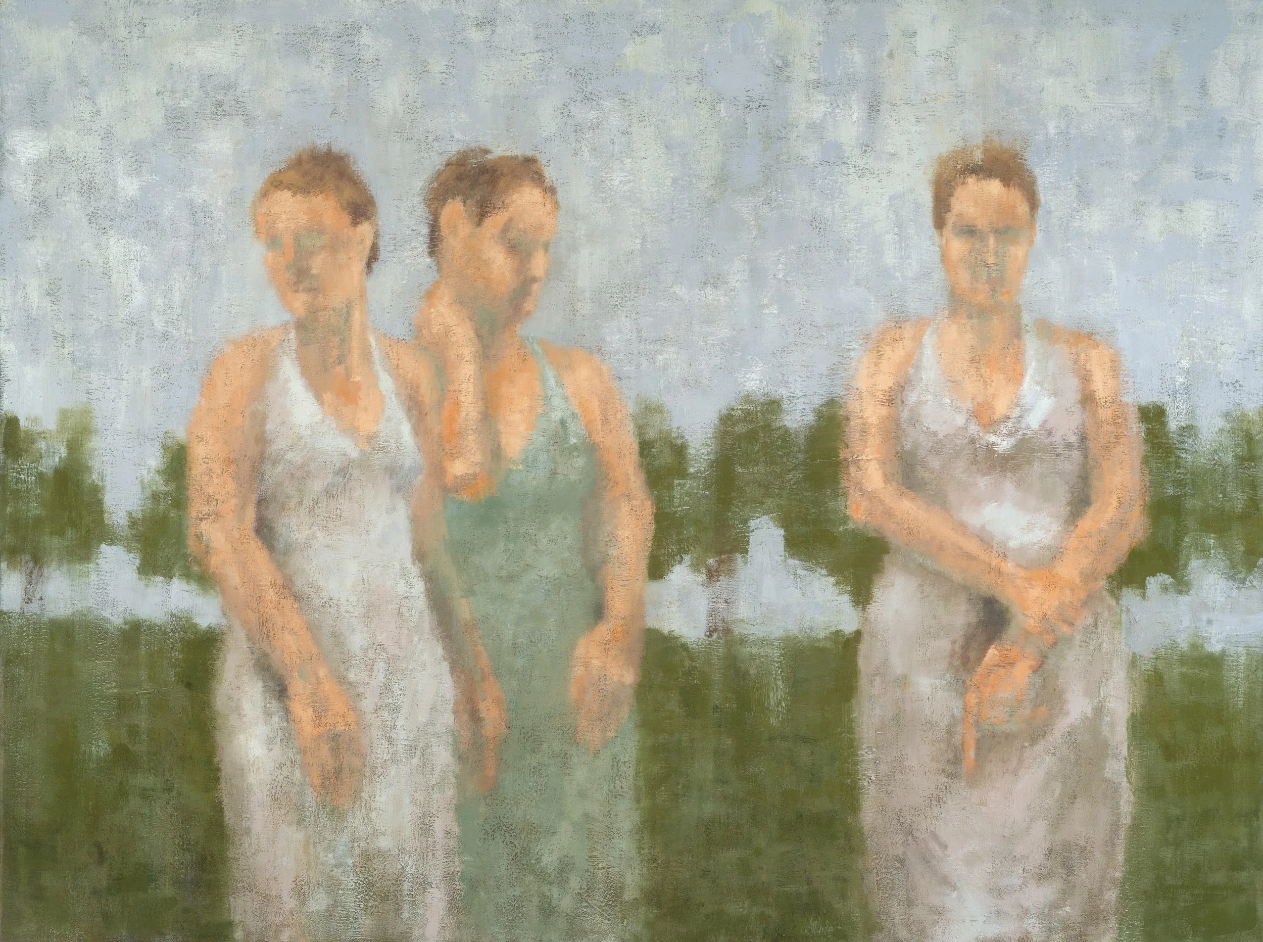 Chernow’s impressionistic, painterly style mixes with a subdued color palette to create works that are simultaneously mysterious and emotionally rich. The figures in her paintings are softly blurred with hues of gray-greens and blues, their eyes and facial features similar shades as the backgrounds they stand in front of. And yet, these characters seem to wear their hearts on their sleeves, each displaying a unique and very distinct emotion.