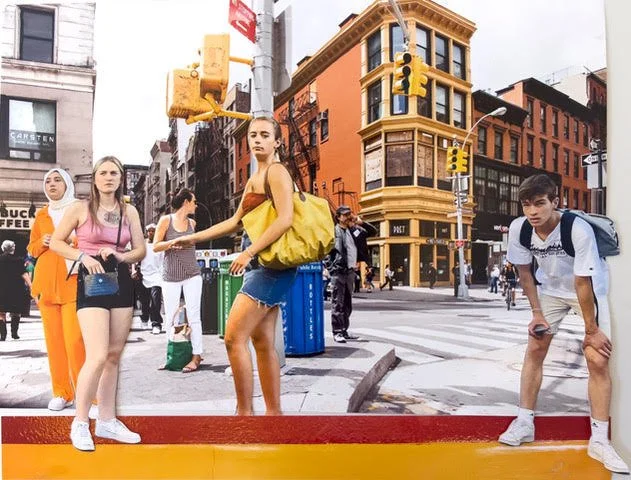 Logan’s collages are handmade. She finds one photograph that sets the stage, much like the set of an opera or a play. She then cuts out pieces from her other images and arranges them on top. On occasion, she adds a piece of an image by a favorite photographer such as William Eggleston or Stephen Shore in order to create her colorful, vibrant artworks.