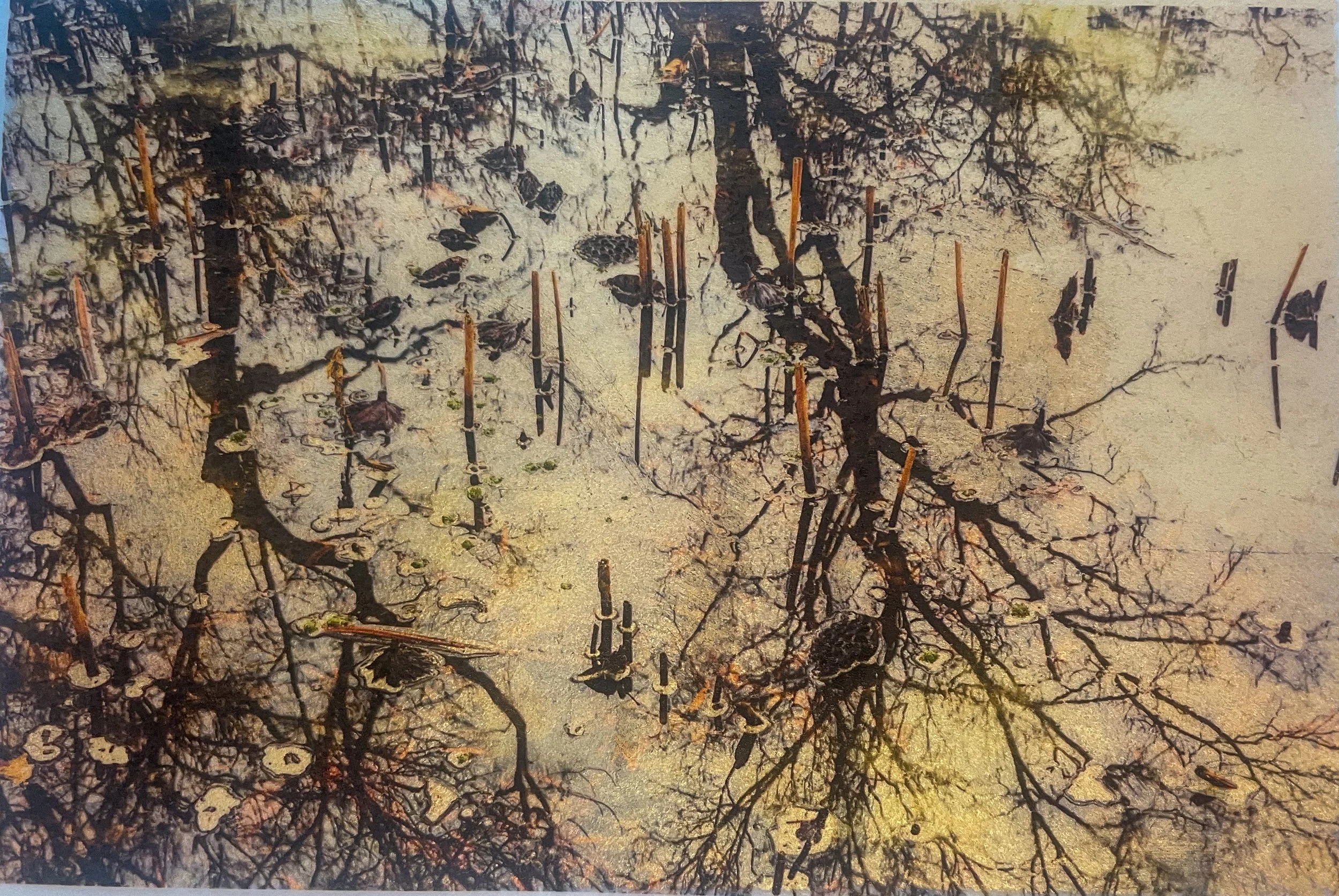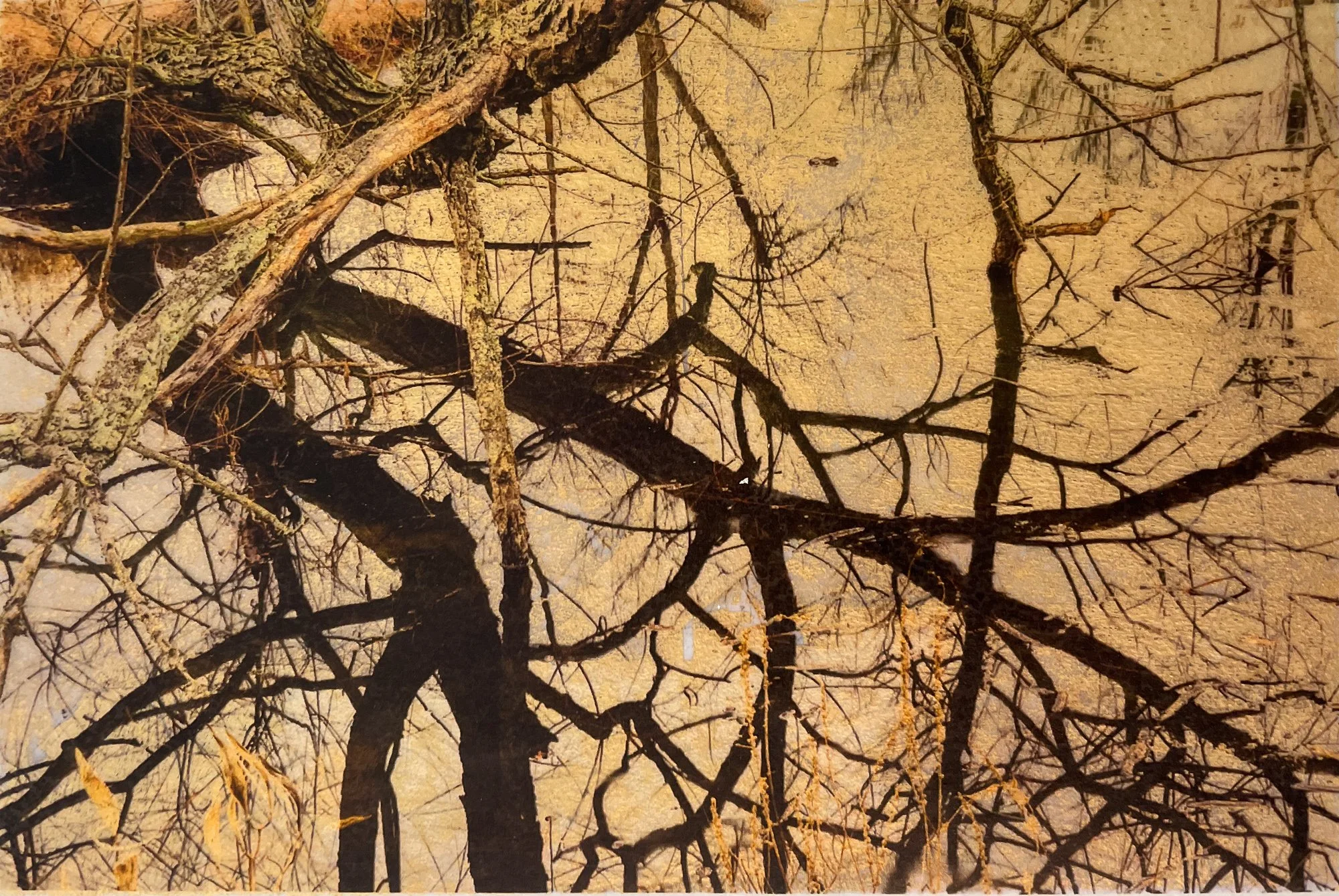As a photographer, I focus on the transitions between life and death, growth and withering; the eternal cycle of life. While these depictions were initially made with new technologies, i.e. a digital camera and processing, I wanted to enhance the sense of time passing by altering the final image through an old technology: Hand Gilding. Each completed image is hand gilded using very thin sheets of 24 carat gold leaf and then sealed to protect the print over time. My hope is that the richness of the gold color draws the viewer into the picture in a new way.