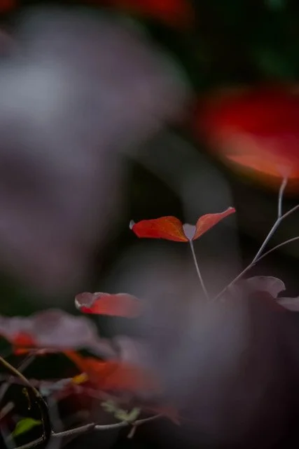 My impressionistic take on the glorious reds of the season differs markedly from both my traditional street photography and my recent abstract expressionism. This series is a fantasy of haute couture foliage illustrating “Autumn” by Emily Dickinson.