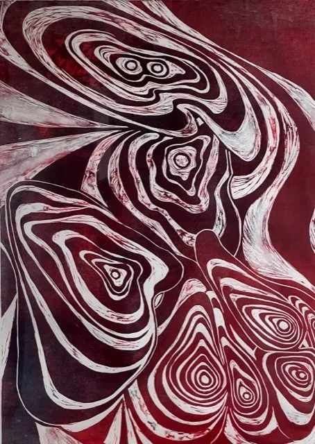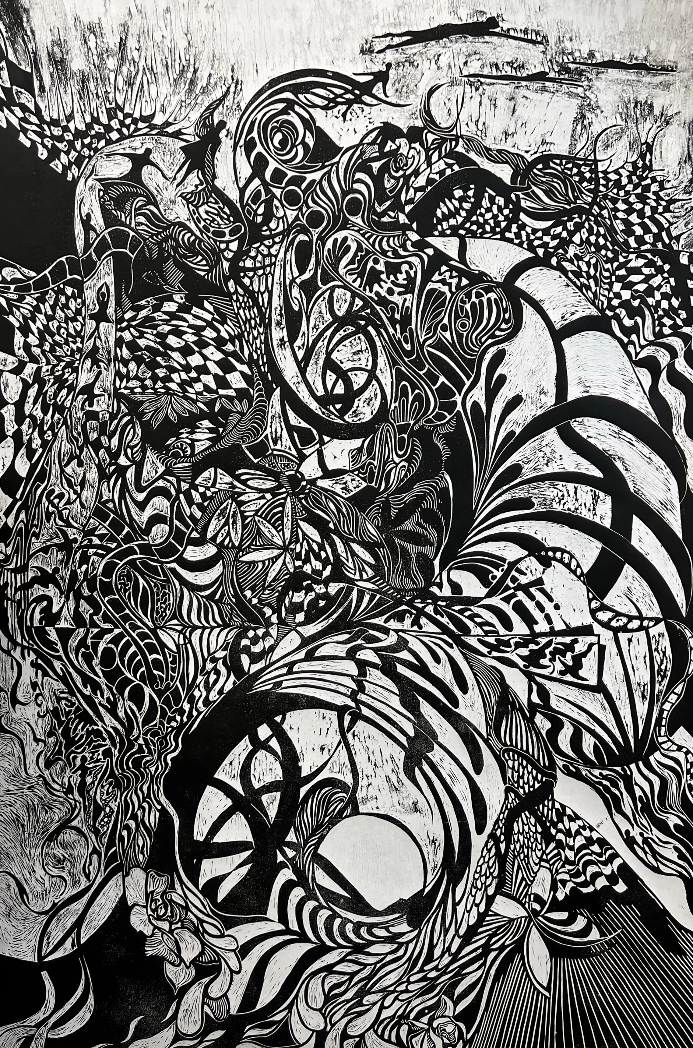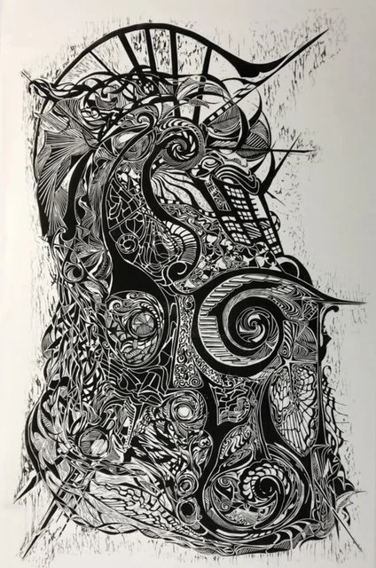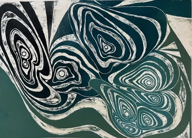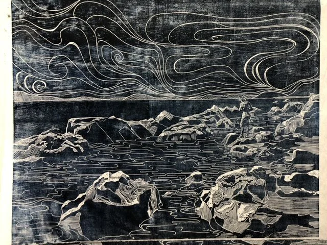 The sound installation in the front room of the gallery includes seven globes that represent each of the seven sisters. A thread of music plays through each globe and interacts with threads of music coming from the other globes to create shifting harmonies. The music you hear is determined by both time and place. Each thread cycles through its melody independently, so that the complete composition repeats itself rarely during the show. Where you stand determines which globes you will hear, which will dominate, which will be quiet or inaudible. The woodblock prints in the rest of the gallery, and the prints from which the globes were made, are all expressions of the constant passing of time and the shifting experiences of who and where we are.