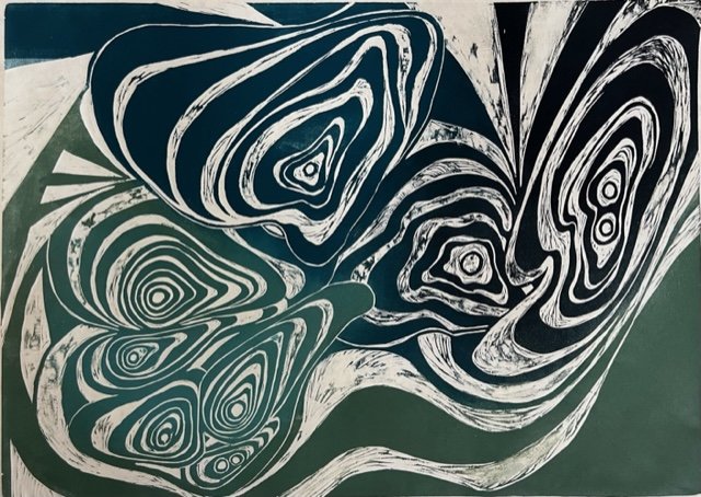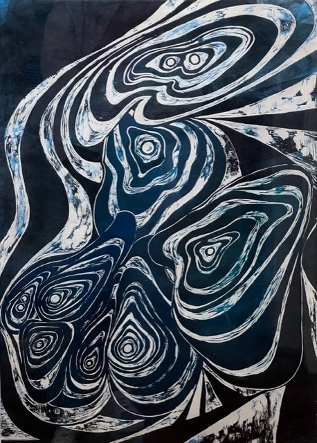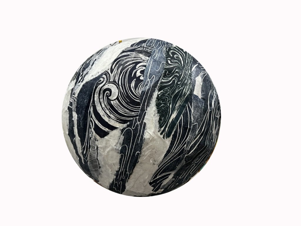 This show is a collaboration between Ellie Jakes, who composed the music and engineered the sound, and Carolee Jakes who created the prints and built the globes. The show is curated by Gaby Mizes.