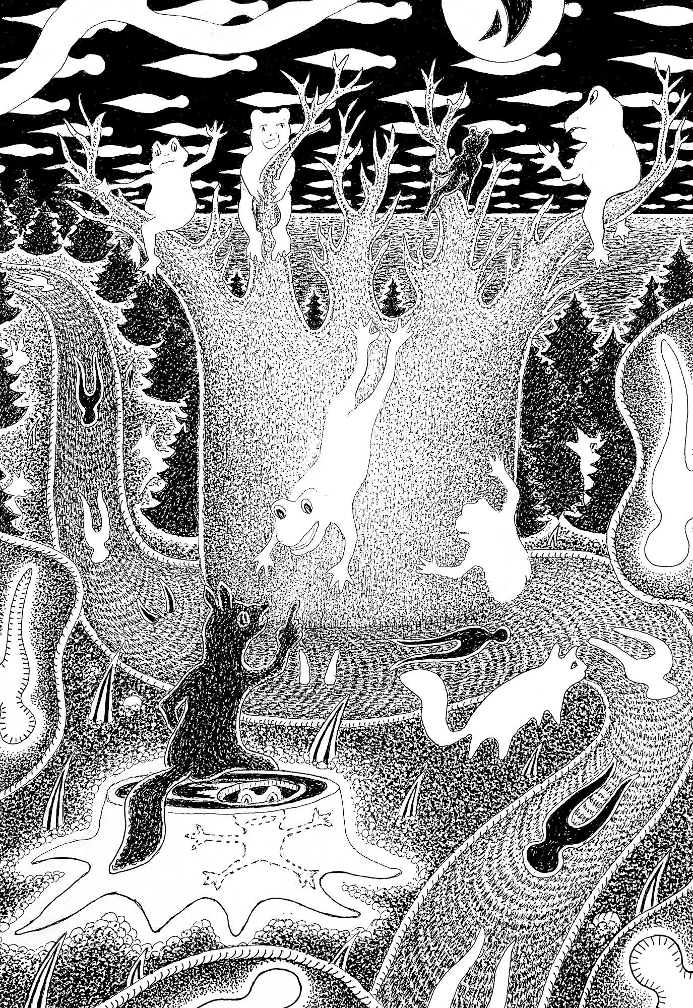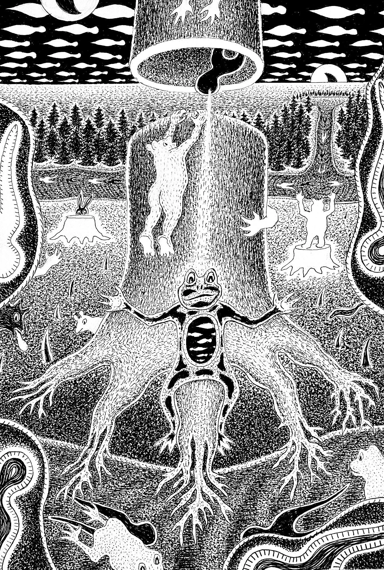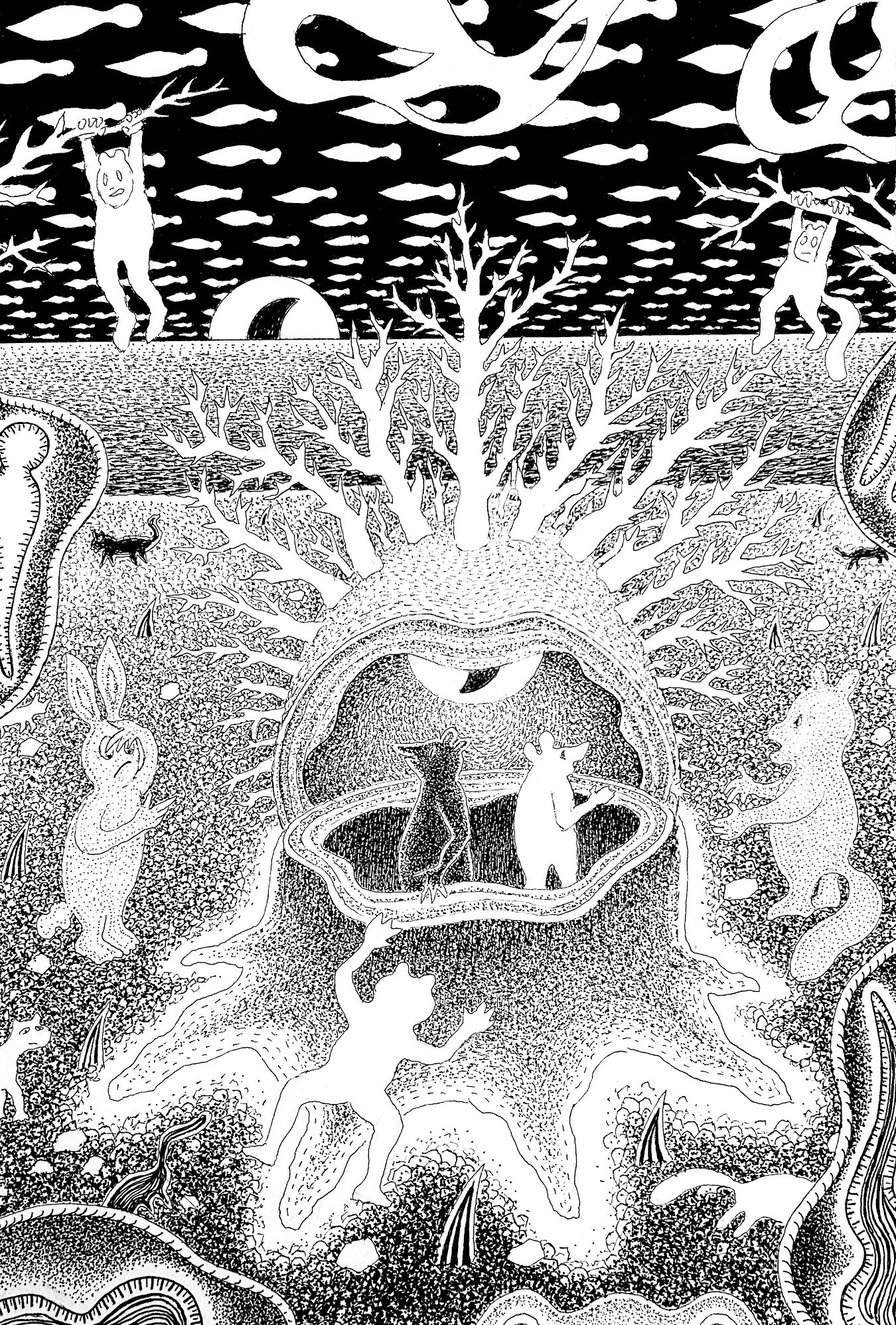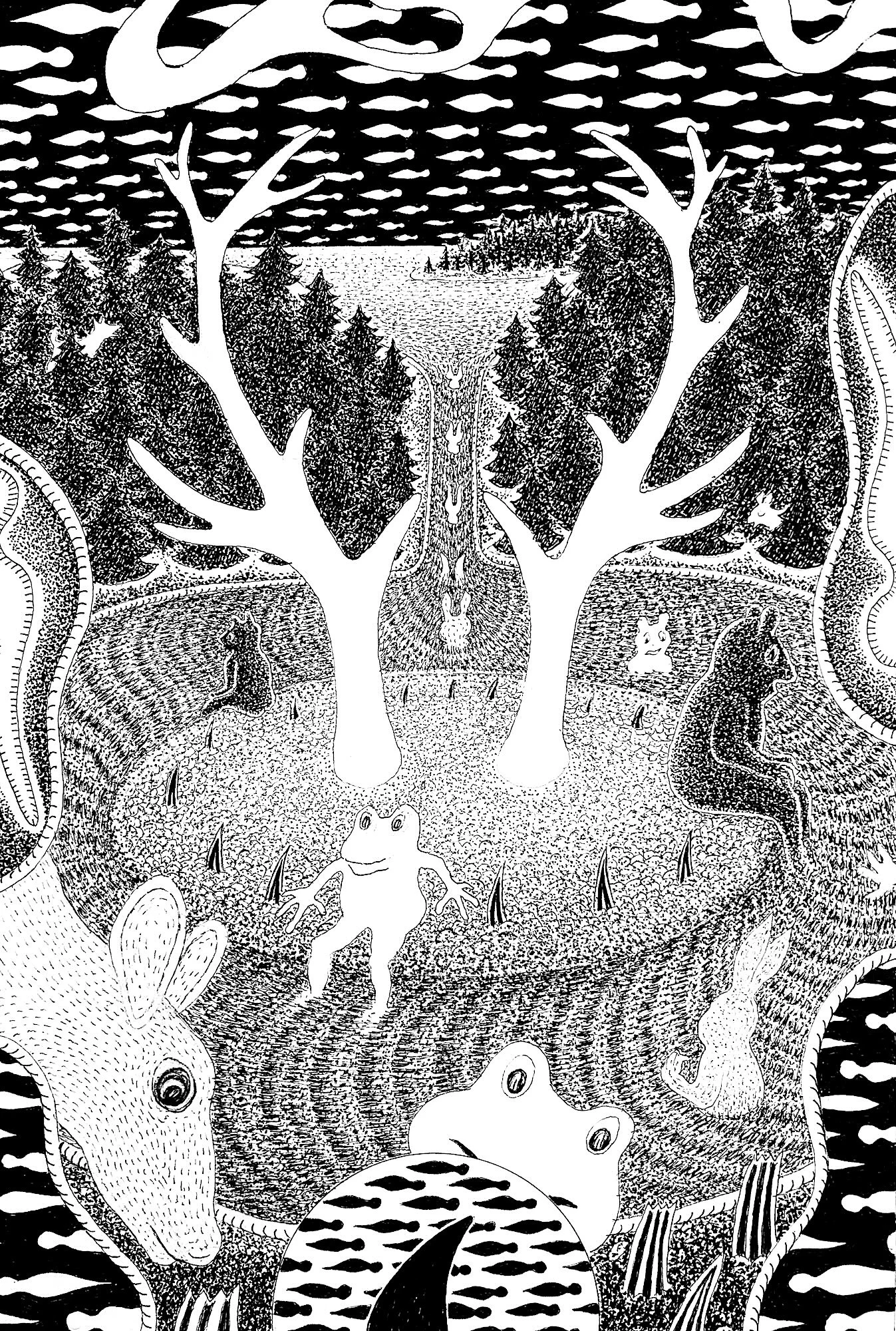 The drawings in Twilight Gatherings serve as both reflections and interpretations of a convoluted voice in a likewise convoluted world. Using pen and paper, reality and perception are synthesized through the creative process, incorporating imagination, observation, and nostalgia. Each drawing takes place in an otherworldly landscape where animals, forest creatures, spirits, and lost souls gather. Where a celestial armada of tadpole-like comets fills the skies, tree stumps and woodlands fill the grounds, and waterways envelop the landscape. These are all elements of my earlier drawings that are still evident.