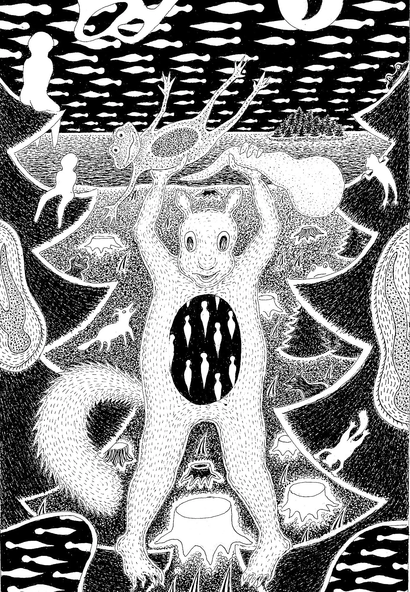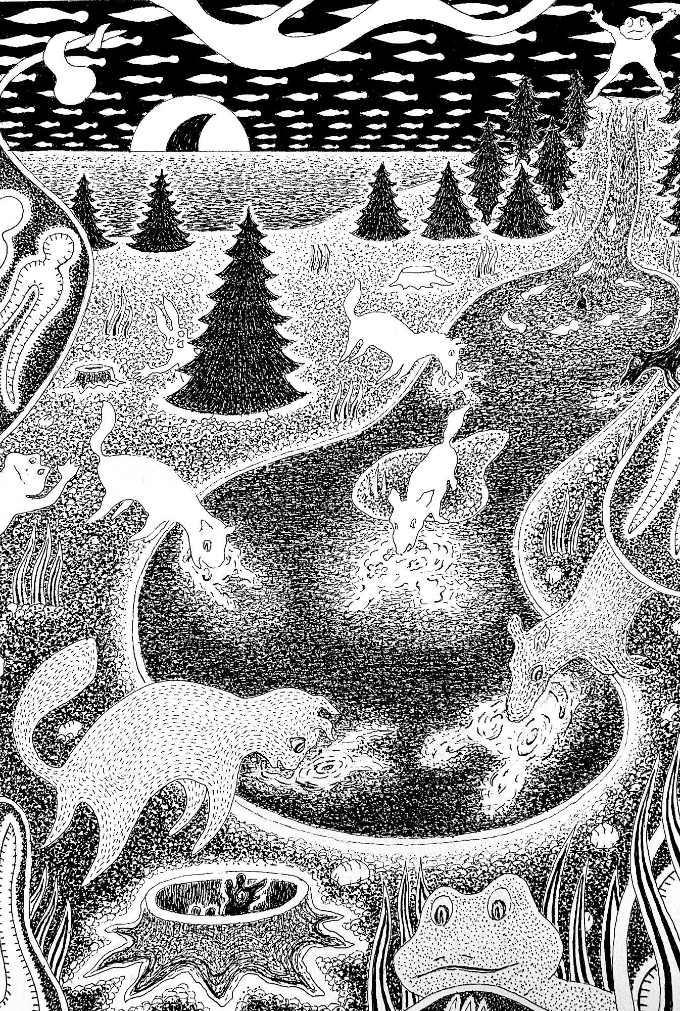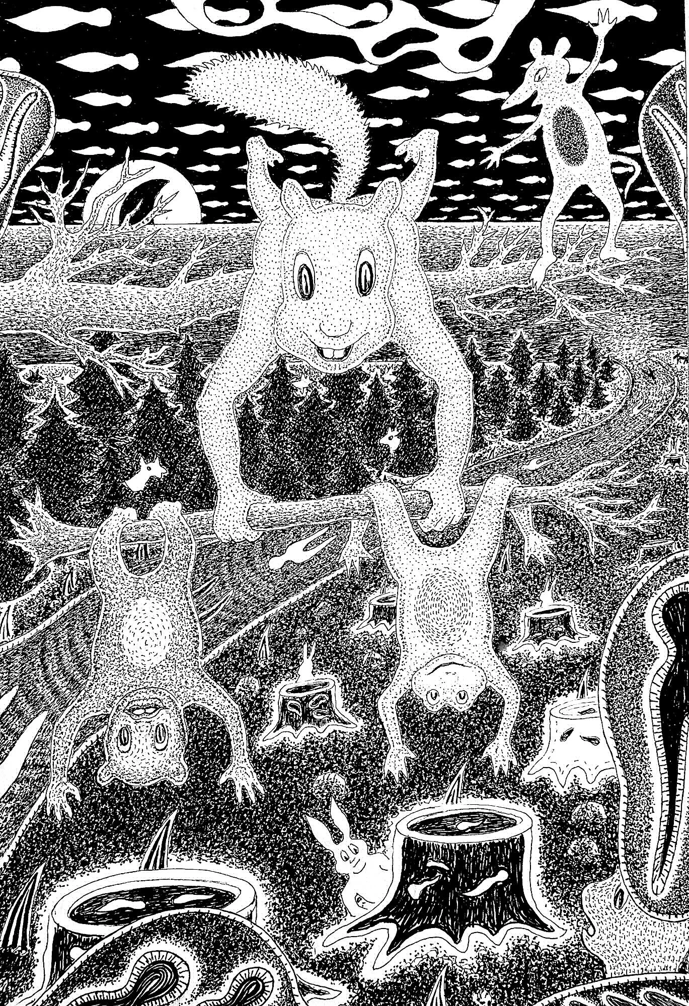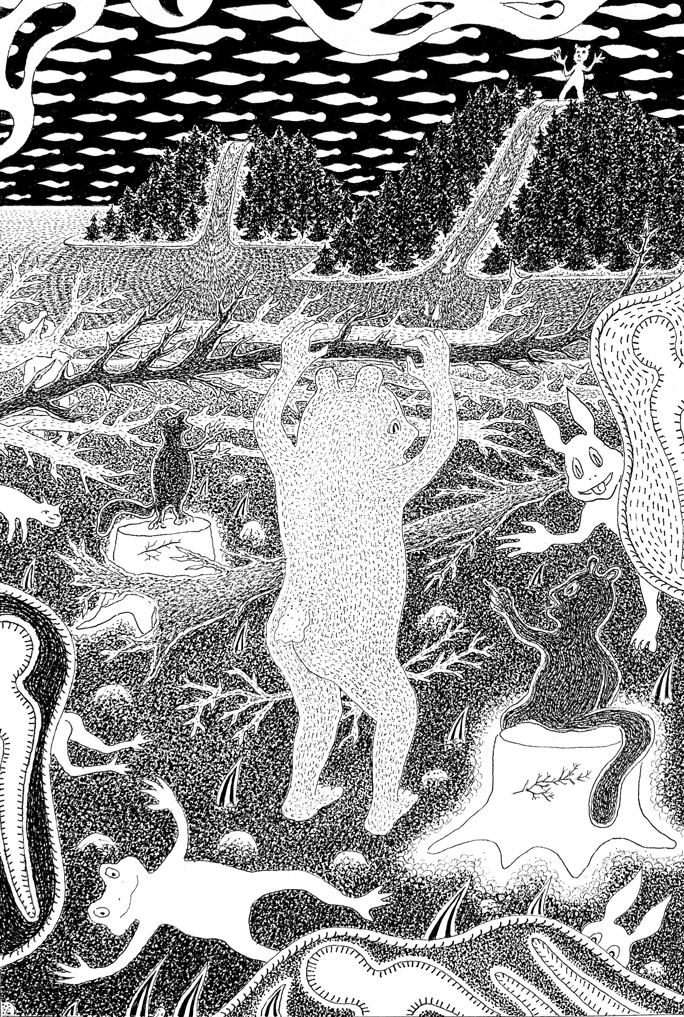 The drawings in Twilight Gatherings serve as both reflections and interpretations of a convoluted voice in a likewise convoluted world. Using pen and paper, reality and perception are synthesized through the creative process, incorporating imagination, observation, and nostalgia. Each drawing takes place in an otherworldly landscape where animals, forest creatures, spirits, and lost souls gather. Where a celestial armada of tadpole-like comets fills the skies, tree stumps and woodlands fill the grounds, and waterways envelop the landscape. These are all elements of my earlier drawings that are still evident.