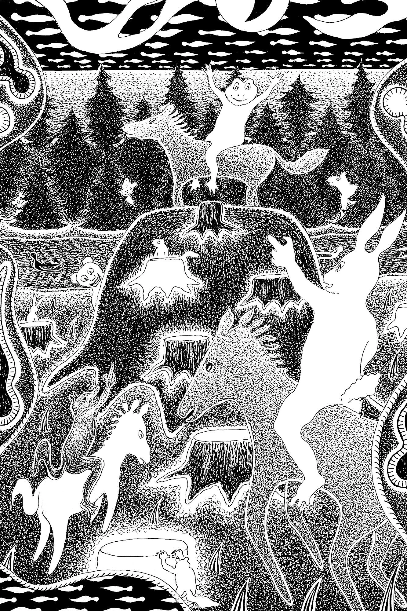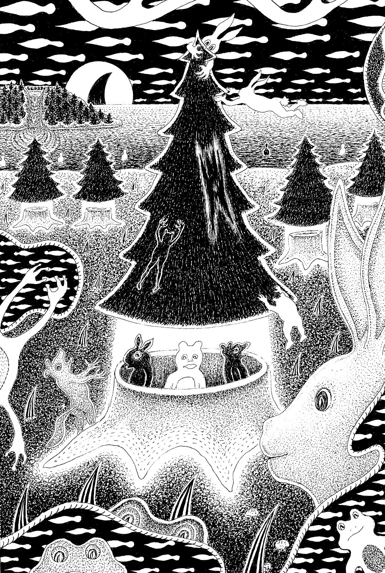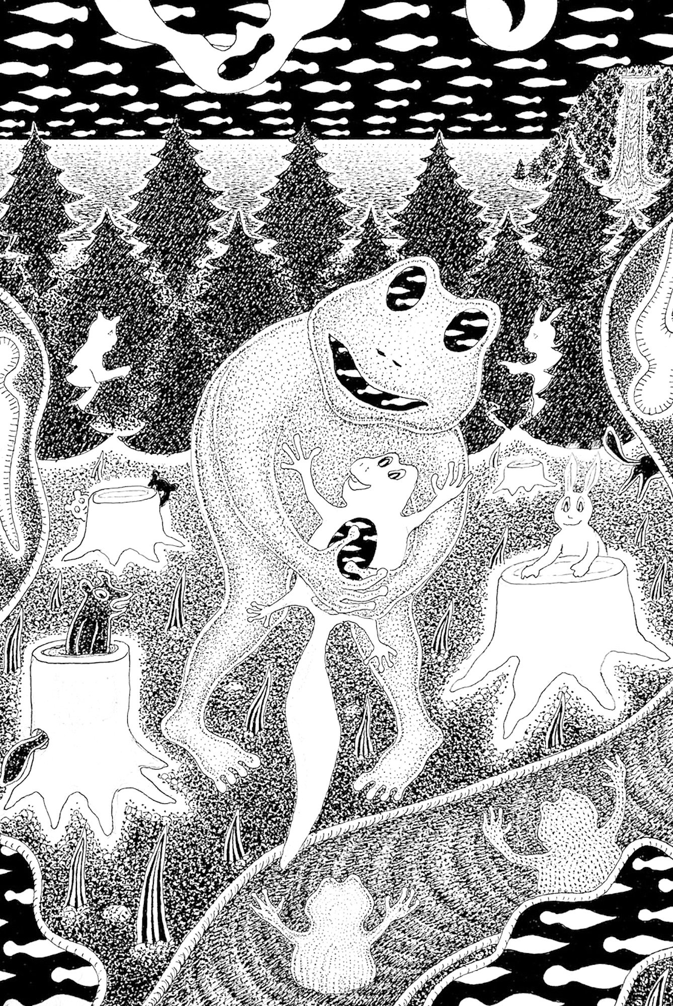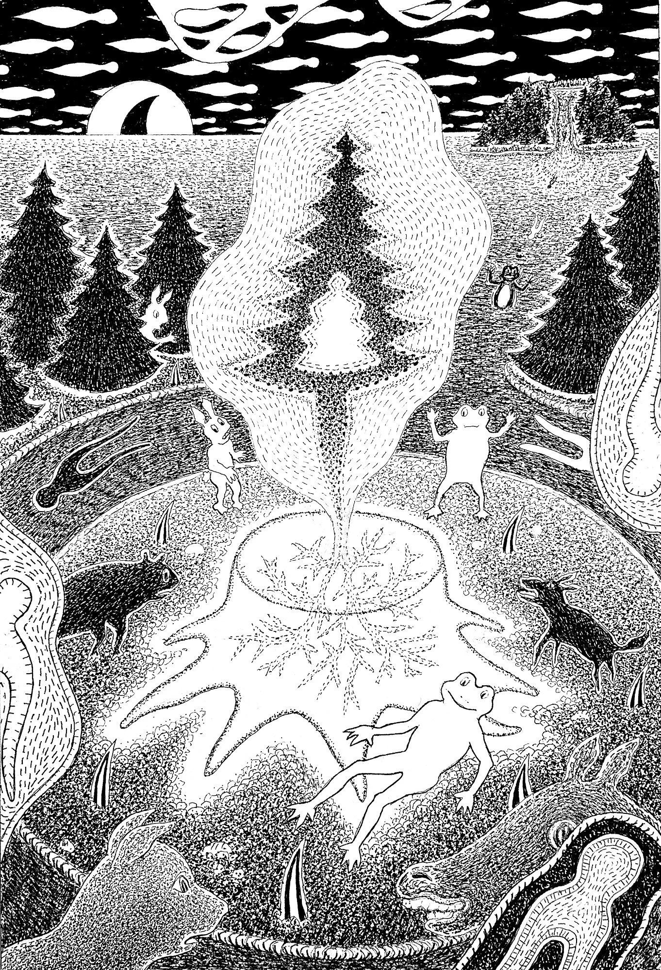 The drawings in Twilight Gatherings serve as both reflections and interpretations of a convoluted voice in a likewise convoluted world. Using pen and paper, reality and perception are synthesized through the creative process, incorporating imagination, observation, and nostalgia. Each drawing takes place in an otherworldly landscape where animals, forest creatures, spirits, and lost souls gather. Where a celestial armada of tadpole-like comets fills the skies, tree stumps and woodlands fill the grounds, and waterways envelop the landscape. These are all elements of my earlier drawings that are still evident.